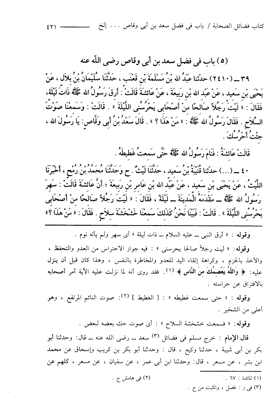 39 - (2410) حدّثنا عَبْدُ اللهِ بْنُ مَسْلَمَةَ بْنِ قَعْنَبٍ، حَدَّثَنَا سُلَيْمَانُ بْنُ بِلاَلٍ، عَنْ يَحْيَى بْنِ سَعِيدٍ، عَنْ عَبْدِ اللهِ بْنِ رَبِيعَةَ، عَنْ عَائِشَةَ قَالَتْ: أَرِقَ رَسُولُ اللِه صَلَّى اللَّهُ عَلَيْهِ وَسَلَّمَ ذَاتَ لَيْلَةٍ، فَقَالَ: " لَيْتَ رَجُلاً صَالِحًا مِنْ أَصْحَابِى يَحْرُسُنِى اللَّيْلَةَ ". قَالَتْ: وَسَمِعْنَا صَوْتَ السِّلاَح. فَقَالَ رَسُولُ اللهِ صَلَّى اللَّهُ عَلَيْهِ وَسَلَّمَ: " مَنْ هَذَا؟ ". قَالَ سَعْدُ بْنُ أَبِى وَقَّاصٍ: يَا رَسُولَ اللهِ، جِئْتُ أَحْرُسُكَ.