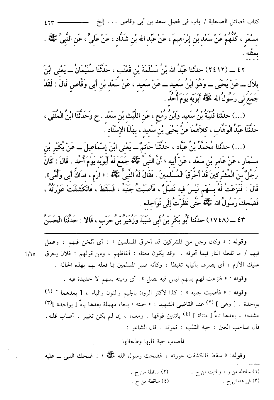 (...) حدّثنا مُحَمَّدُ بْنُ عَبَّادٍ، حَدَّثَنَا حَاتِمٌ - يَعْنِى ابْنَ إِسْمَاعِيلَ - عَنْ بُكَيْرِ بْنِ مِسْمَارٍ، عَنْ عَامِرِ بْنِ سَعْدٍ، عَنْ أَبِيهِ، أَنَّ النَّبِىَّ صَلَّى اللَّهُ عَلَيْهِ وَسَلَّمَ جَمَعَ لَهُ أَبَوَيْهِ يَوْمَ أُحُدٍ. قَالَ: كَانَ رَجُلٌ مِنَ الْمُشْرِكِينَ قَدْ أَحْرَقَ الْمُسْلِمِينَ. فَقَالَ لَهُ النَّبِىُّ صَلَّى اللَّهُ عَلَيْهِ وَسَلَّمَ: "ارْمِ، فِدَاكَ أَبِى وَأُمِّى ". قَالَ: فَنَزَعْتُ لَهُ بِسَهْمٍ لَيْسَ فِيهِ نَصْلٌ، فَأَصَبْتُ جَنْبَهُ، فَسَقَطَ، فَانْكَشَفَتْ عَوْرَتُهُ، فَضَحِكَ رَسُولُ اللهِ صَلَّى اللَّهُ عَلَيْهِ وَسَلَّمَ حَتَّى نَظَرْتُ إِلَى نَوَاجِذِهِ.