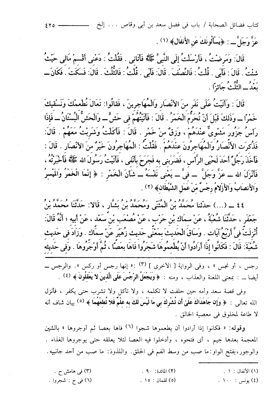 قَالَ: وَأَتَيْتُ عَلَى نَفَرٍ مِنَ الأَنْصَارِ وَالْمُهَاجِرِينَ، فَقالُوا: تَعَالَ نُطْعِمْكَ وَنَسْقِيكَ خَمْرًا - وَذَلِكَ قَبْلَ أَنْ تُحَرُّمَ الْخَمْرُ. قَالَ: فَأَتَيْتُهُمْ فِى حَشٍّ - وَالْحَشُّ الْبُسْتَانُ - فَإِذَا رَأسُ جَزُورٍ مَشْوِىٌّ عِنْدَهُمْ، وَزِقٌّ مِنْ خَمْرٍ. قَالَ: فَأَكَلْتُ وَشَرِبْتُ مَعَهُمْ. قَالَ: فَذُكِرَتِ الأَنْصَارُ وَالْمُهَاجِرُونَ عِنْدَهُمْ. فَقُلْتُ: الْمُهَاجِرُونَ خَيْرٌ مِنَ الأَنْصَارِ. قَالَ: فَأَخَذَ رَجُلٌ أَحَدَ لَحْيَى الرَّأسِ، فَضَرَبنِى بِهِ فَجَرَحَ بِأَنْفِى، فَأَتَيْتُ رَسُولَ اللهِ صَلَّى اللَّهُ عَلَيْهِ وَسَلَّمَ فَأَخْبَرْتُهُ، فَأَنْزَلَ الله - عَزَّ وَجَلَّ - فِىَّ - يَعْنِى نَفْسَهُ - شَأنَ الْخَمْرِ: {إِنَّمَا الْخَمْرُ وَالمَيْسِرُ وَالأَنصَابُ وَالأَزْلامُ رِجْسٌ مِنْ عَمَلِ الشَّيْطَانِ} (¬2).
