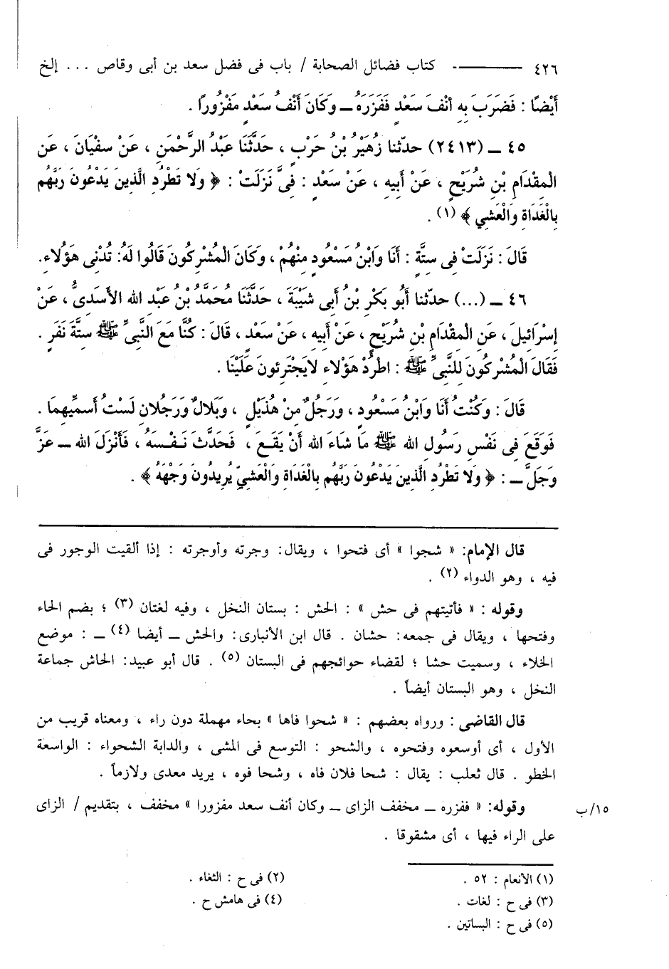 45 - (2413) حدّثنا زُهَيْرُ بْنُ حَرْبٍ، حَدَّثَنَا عَبْدُ الرَّحْمَنِ، عَنْ سُفْيَانَ، عَن الْمِقْدَامِ بْنِ شُرَيْحٍ، عَنْ أَبِيهِ، عَنْ سَعْدٍ: فِىَّ نَزَلَتْ: {وَلا تَطْرُدِ الَّذِينَ يَدْعُونَ رَبَّهُم بِالْغَدَاةِ وَالْعَشِي} (¬1).