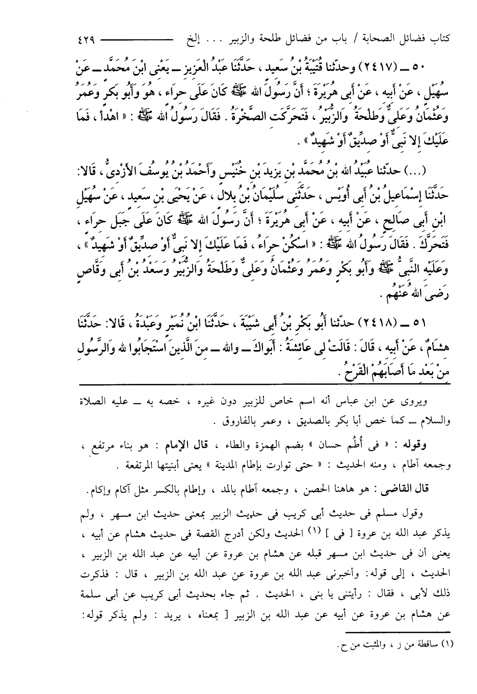 50 - (2417) وحدّثنا قُتَيْبَةُ بْنُ سَعِيدٍ، حَدَّثَنَا عَبْدُ الْعَزِيزِ - يَعْنِى ابْنَ مُحَمَّدٍ - عَنْ سُهَيْلٍ، عَنْ أَبِيهِ، عَنْ أَبِى هُرَيْرَةَ؛ أَنَّ رَسُولَ اللهِ صَلَّى اللَّهُ عَلَيْهِ وَسَلَّمَ كَانَ عَلَى حِرَاءٍ، هُوَ وَأَبُو بَكرِ وَعُمَرُ وَعُثْمَانُ وَعَلِىٌّ وَطَلْحَةُ وَالزُّبَيْرُ، فَتَحَرَّكَتِ الصَّخْرَةُ. فَقَالَ رَسُولُ اللهِ صَلَّى اللَّهُ عَلَيْهِ وَسَلَّمَ: " اهْدأ، فَمَا عَلَيْكَ إِلا نَبِىٌّ أَوْ صِدِّيقٌ أَوْ شَهِيدٌ ".