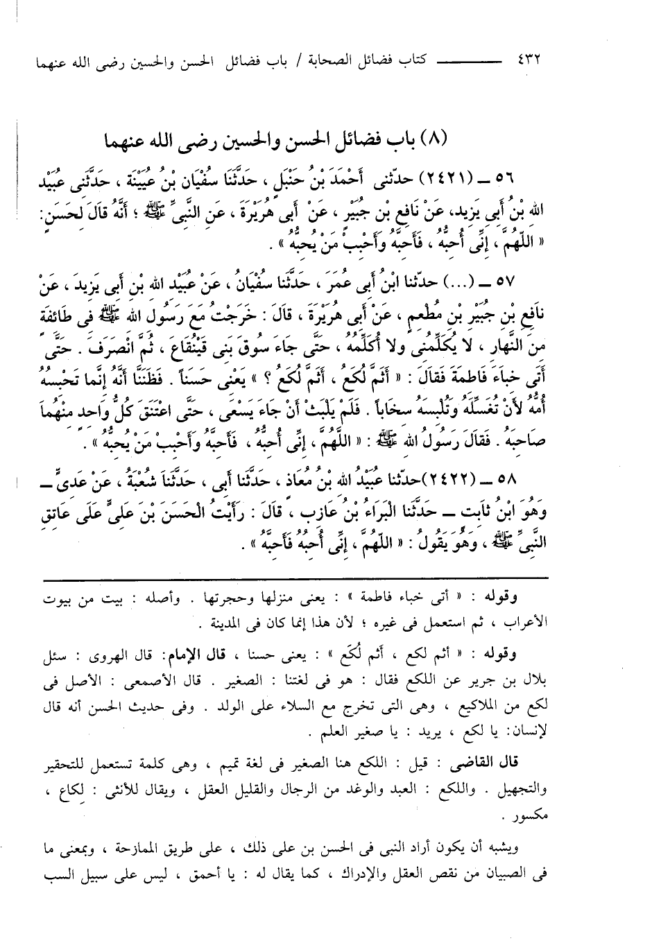 56 - (2421) حدّثنى أَحْمَدَ بْنُ حَنْبَلٍ، حَدَّثَنَا سُفْيَان بْنُ عُيَيْنَة، حَدَّثَنِى عُبَيْد اللهِ بْنُ أَبِى يَزِيد، عَنْ نَافِعِ بْن جُبَيْرٍ، عَنْ أَبِى هُرَيْرَةَ، عَنِ النَّبِىِّ صَلَّى اللَّهُ عَلَيْهِ وَسَلَّمَ؛ أَنَّهُ قَالَ لِحَسَنٍ: " اللهُمَّ، إِنِّى أُحِبُّهُ، فَأَحِبَّهُ وَأَحْبِبْ مَنْ يُحِبُّهُ ".