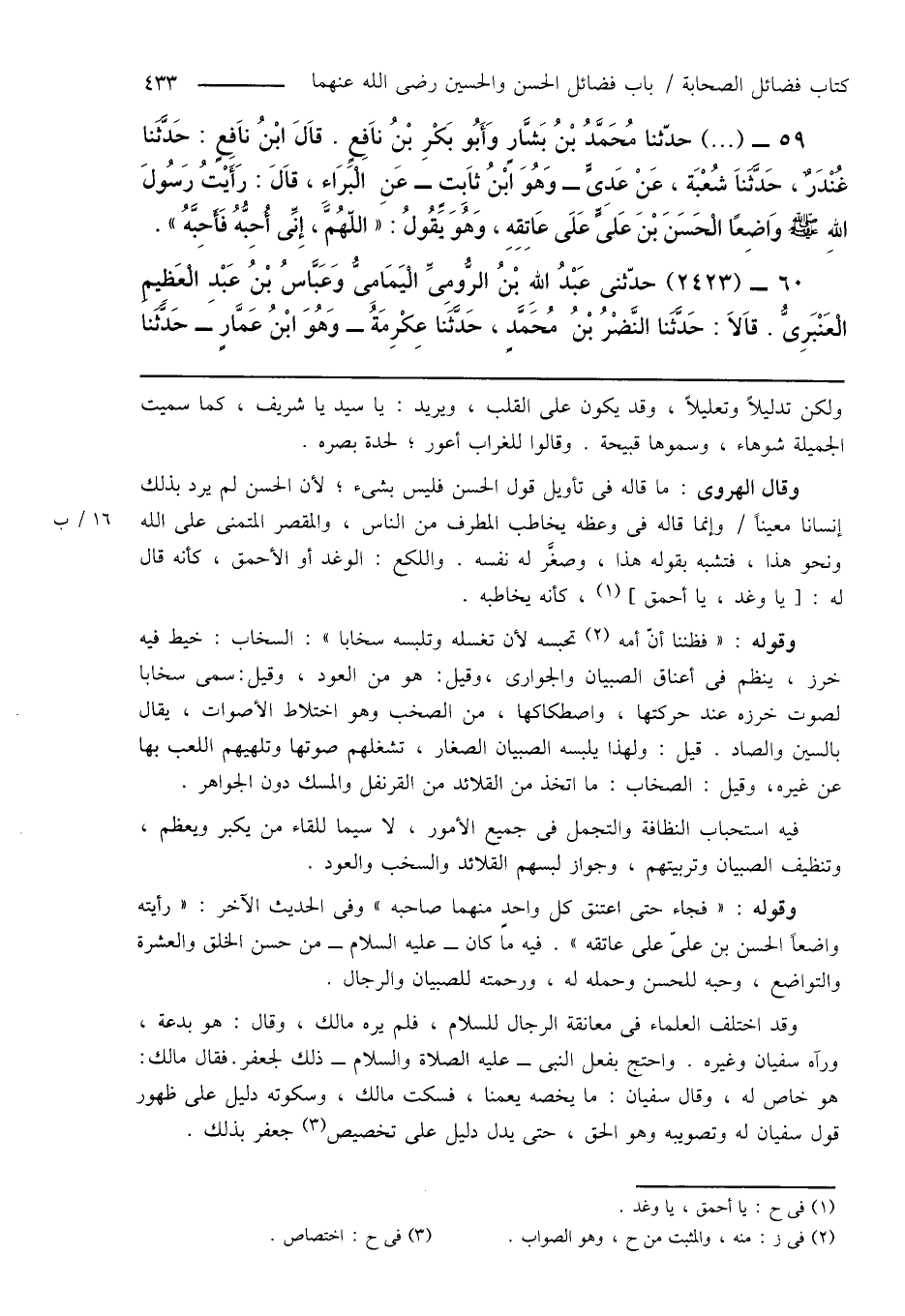 59 - (...) حدّثنا مُحَمَّدُ بْنُ بَشَّارٍ وَأَبُو بَكْرِ بْنُ ناَفِعٍ. قَالَ ابْنُ ناَفِعِ: حَدَّثَنَا غُنْدَرٌ، حَدَّثَنَا شُعْبَةُ، عَنْ عَدِىٍّ - وَهُوَ ابْنُ ثاَبِتٍ - عَنِ الْبَرَاءِ، قَالَ: رَأَيْتُ رَسُولَ اللهِ صَلَّى اللَّهُ عَلَيْهِ وَسَلَّمَ وَاضِعًا الْحَسَنَ بْنَ عَلِىٍّ عَلَى عَاتِقِهِ، وَهُوَ يَقُولُ: " اللهُمَّ، إِنِّى أُحِبُّهُ فَأَحِبَّهُ ".
