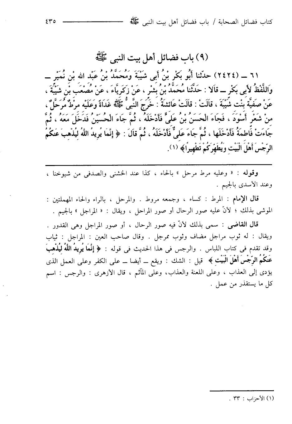 61 - (2424) حدّثنا أَبُو بَكْرٍ بْنُ أَبِى شَيْبَةَ وَمُحَمَّدُ بْنُ عَبْدِ اللهِ بْنِ نُمَيْرٍ - وَاللَّفْظُ لأَبِى بَكْرٍ - قَالا: حَدَّثَنَا مُحَمَّدُ بْنُ بِشْرٍ، عَنْ زَكَرِيَّاءَ، عَنْ مُصْعَبِ بْن شَيْبَةَ، عَنْ صَفِيَّة بِنْتِ شَيْبَةَ، قَالَتْ: قَالَتْ عَائِشَةُ: خَرَجَ النَّبِىُّ صَلَّى اللَّهُ عَلَيْهِ وَسَلَّمَ غَدَاةً وَعَلَيْهِ مِرْطٌ مُرَحَّلٌ، مِنْ شَعْرٍ أَسْوَدَ، فَجَاءَ الْحَسَنُ بْنُ عَلِىٍّ فَأَدْخَلَهُ، ثُمَّ جَاءَ الْحُسَيْنُ فَدَخَلَ مَعَهُ، ثُمَّ جَاءَتْ فَاطِمَةُ فَأَدْخَلَها، ثُمَّ جَاءَ عَلِىٌّ فَأَدْخَلَهُ، ثُمَّ قَالَ: {إِنَّمَا يُرِيدُ اللَّهُ لِيُذْهِبَ عَنكُمُ الرِّجْسَ أَهْلَ الْبَيْتِ وَيُطَهِّرَكُمْ تَطْهِيرًا} (¬1).