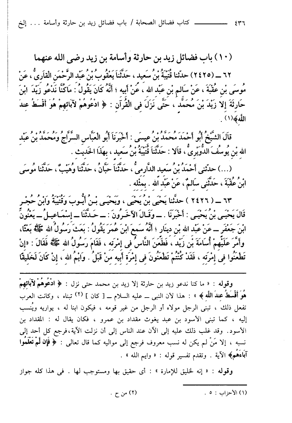 62 - (2425) حدّثنا قُتَيْبَةُ بْنُ سَعِيدٍ، حَدَّثَنَا يَعْقُوبُ بْنُ عَبْدِ الرَّحْمَنِ الْقَارِىُّ، عَنْ مُوسَى بْنِ عُقْبَةَ، عَنْ سَالِمِ بْنِ عَبْدِ اللهِ، عَنْ أَبِيهِ؛ أَنَّهُ كَانَ يَقُولُ: مَا كُنَّا نَدْعُو زَيْدَ ابْنَ حَارِثَةَ إِلا زَيْدَ بْنَ مُحَمَّدٍ، حَتَّى نَزَلَ فِى الْقُرآنِ: {ادْعُوهُمْ لآبَائِهِمْ هُوَ أَقْسَطُ عِندَ اللَّهِ} (¬1).