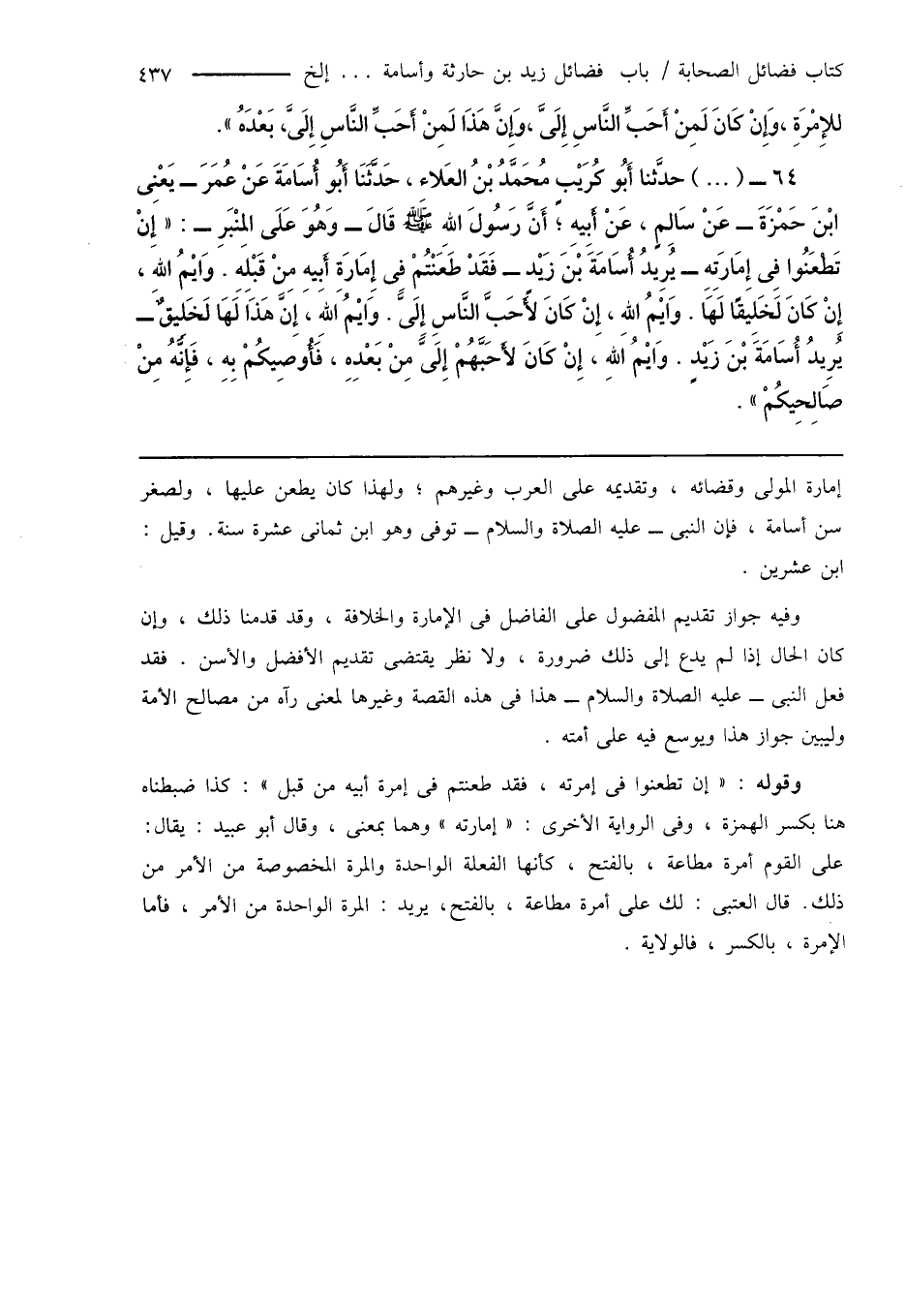 64 - (...) حدَّثنا أَبُو كُرَيْبٍ مُحَمَّدُ بْنُ العَلاءِ، حَدَّثَنَا أَبُو أُسَامَةَ عَنْ عُمَرَ - يَعْنِى ابْنَ حَمْزَةَ - عَنْ سَالِمٍ، عَنْ أَبِيهِ؛ أَنَّ رَسُولَ اللهِ صَلَّى اللَّهُ عَلَيْهِ وَسَلَّمَ قَالَ - وَهُوَ عَلَى المِنْبَرِ -: " إِنْ تَطْعَنُوا فِى إِمَارَتِهِ - يُرِيدُ أُسَامَةَ بْنَ زَيْدٍ - فَقَدْ طَعَنْتُمْ فى إِمَارَةِ أَبِيهِ مِنْ قَبْلَهِ. وَايْمُ اللهِ، إِنْ كَانَ لَخَلِيقًا لَهَا. وَايْمُ اللهِ، إِنْ كَانَ لأَحَبَّ النَّاسِ إلَىَّ. وَايْمُ اللهِ، إِنَّ هَذَا لَهَا لَخَلِيقٌ - يُرِيدُ أُسَامَةَ بْنَ زَيْدٍ. وَايْمُ اللهِ، إِنْ كَانَ لأَحَبَّهُمْ إِلَىَّ مِنْ بَعْدِهِ، فَأُوصِيكُمْ بِهِ، فَإِنَّهُ مِنْ صَالِحِيكُمْ ".