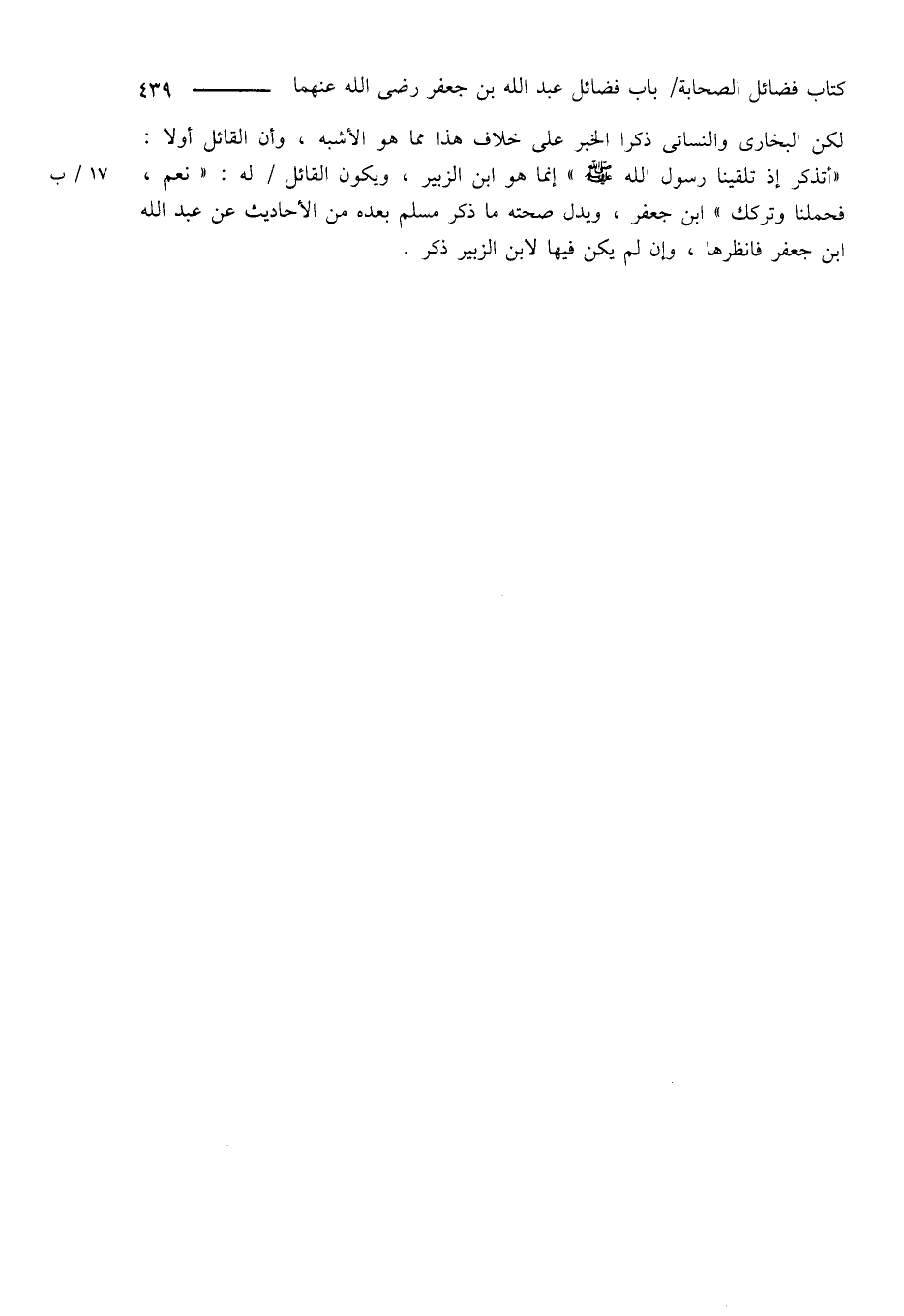 لكن البخارى والنسائى ذكرا الخبر على خلاف هذا مما هو الأشبه، وأن القائل أولاً: " أتذكر إذ تلقينا رسول الله صَلَّى اللَّهُ عَلَيْهِ وَسَلَّمَ " إنما هو ابن الزبير، ويكون القائل له: " نعم، فحملنا وتركك " ابن جعفر، ويدل صحته ما ذكر مسلم بعده من الأحاديث عن عبد الله ابن جعفر فانظرها، وإن لم يكن فيها لابن الزبير ذكر.
