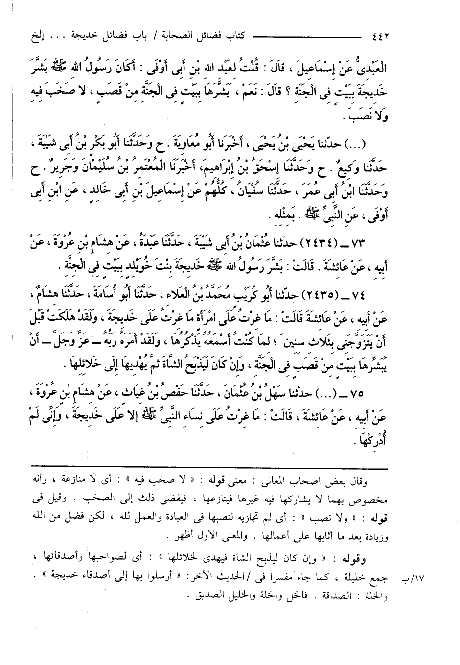 74 - (2435) حدّثنا أَبُو كُرَيْبٍ مُحَمَّدُ بْنُ الْعَلاءِ، حَدَّثَنَا أَبُو أُسَامَةَ، حَدَّثَنَا هِشَامٌ، عَنْ أَبِيهِ، عَنْ عَائِشَةَ قَالَتْ: مَا غِرْتُ عَلَى امْرَأَةٍ مَا غِرْتُ عَلَى خَدِيجَةَ، وَلَقَدْ هَلَكَتْ قَبْلَ أَنْ يَتَزَوَّجَنِى بِثَلاَثِ سِنِينَ؛ لِمَا كُنْتُ اسْمَعُهُ يَذْكُرُهَا، وَلَقَدْ أَمَرَهُ رَبَّهُ - عَزَّ وَجَلَّ - أَنْ يُبَشِّرُهَا بِبَيْتٍ مِنْ قَصَبٍ فِى الْجَنَّةِ، وَإِنْ كَانَ لَيَذْبَحُ الشَّاةَ ثُمَّ يُهْدِيهَا إِلَى خَلائِلِهَا.