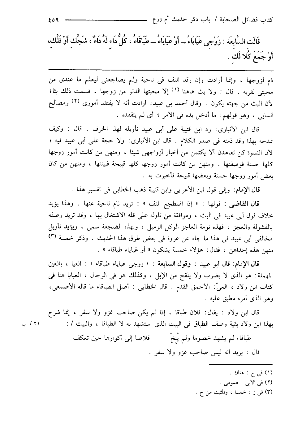 قال ابن الأنبارى: رد ابن قتيبة على أبى عبيد تأويله لهذا الحرف. قال: وكيف تمدحه بهذا وقد ذمته فى صدر الكلام. قال ابن الأنبارى: ولا حجة على أبى عبيد فيه؛ لأن النسوة كن تعاهدن ألا يكتمن من أخبار أزواجهن شيئاً، ومنهن من كانت أمور زوجها كلها حسنة فوصفتها. ومنهن من كانت أمور زوجها كلها قبيحة فبينتها، ومنهن من كان بعض أمور زوجها حسنة وبعضها قبيحة فأخبرت به.