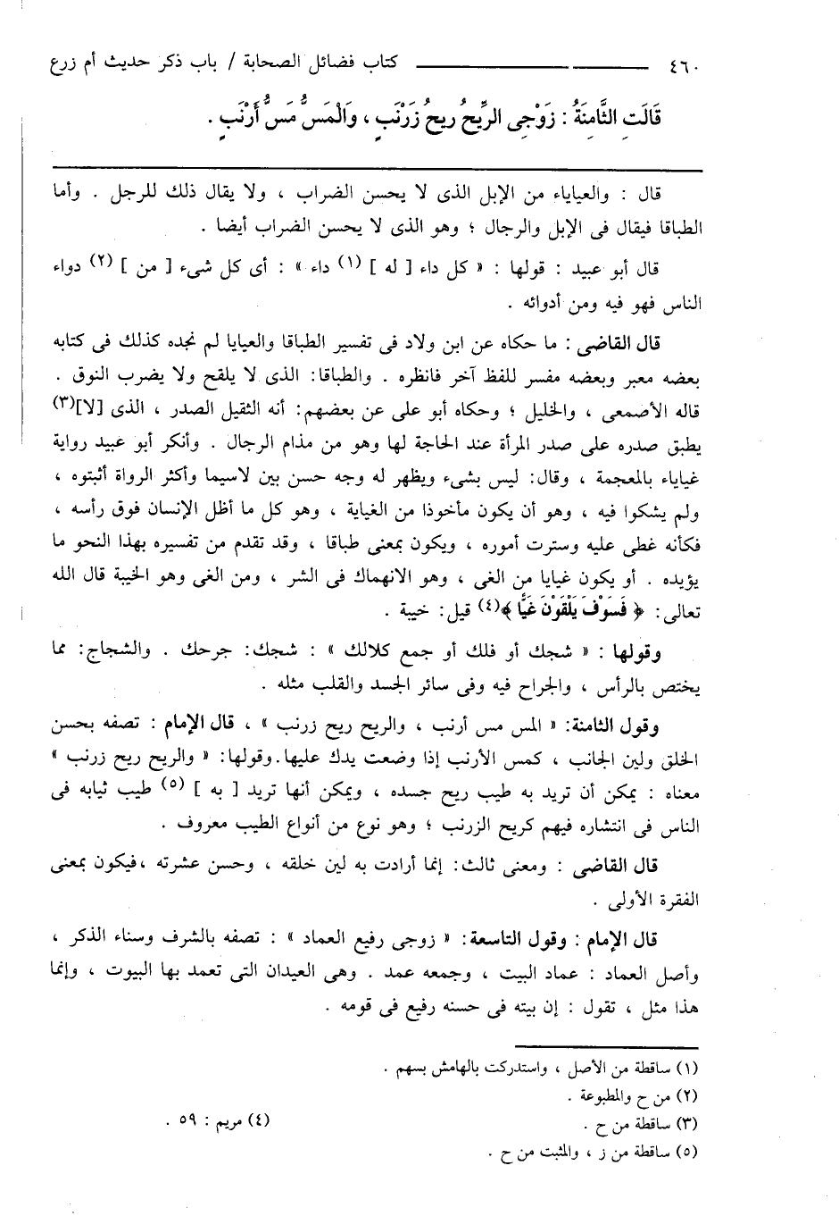 وقول الثامنة: " المس مس أرنب، والريح ريح زرنب "، قال الإمام: تصفه بحسن الخلق ولين الجانب، كمس الأرنب إذا وضعت يدك عليها. وقولها: " والريح ريح زرنب " معناه: يمكن أن تريد به طيب ريح جسده، ويمكن أنها تريد [به] (¬5) طيب ثيابه فى الناس فى انتشاره فيهم كريح الزرنب؛ وهو نوع من أنواع الطيب معروف.