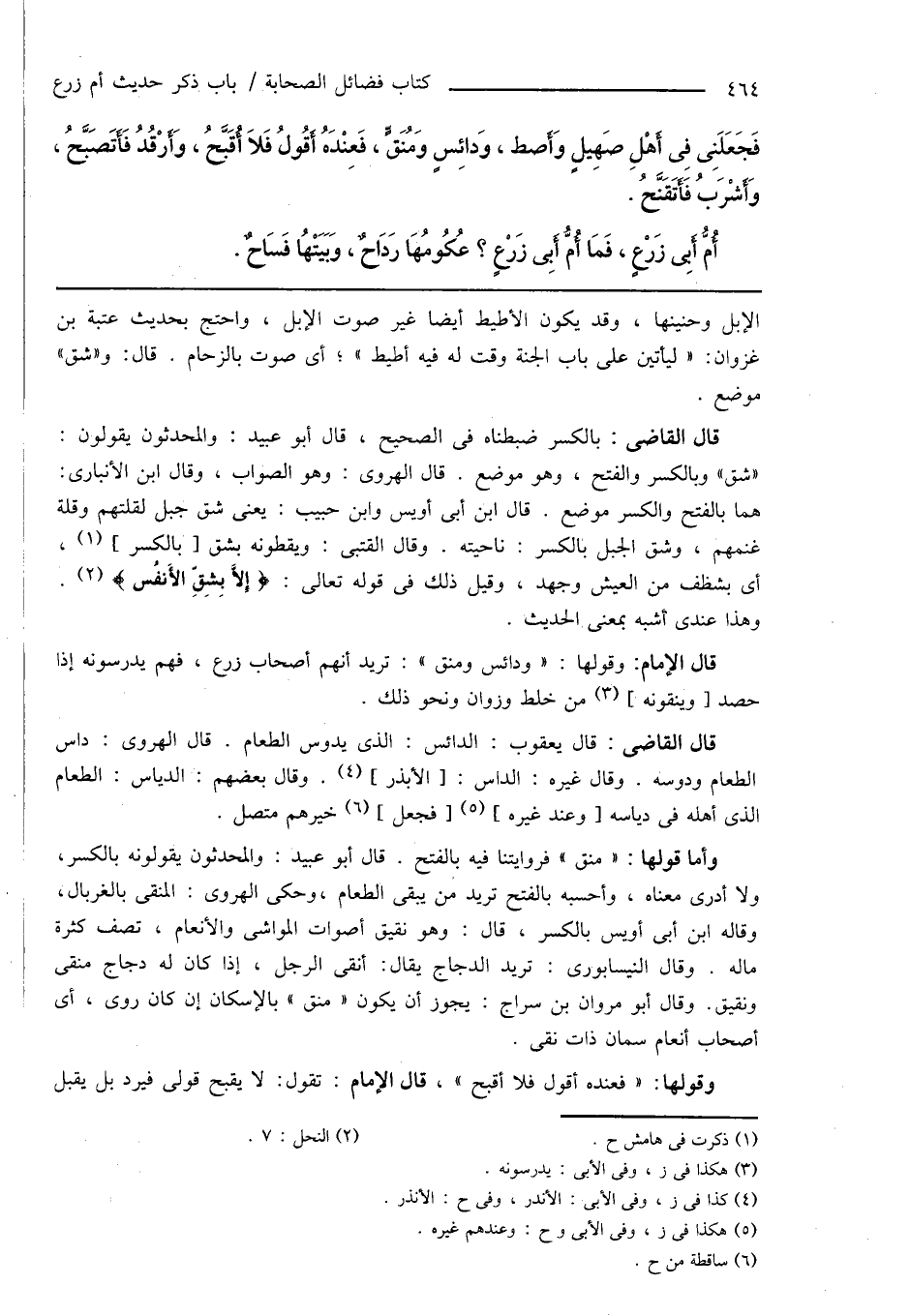 وأما قولها: " منق " فروايتنا فيه بالفتح. قال أبو عبيد: والمحدثون يقولونه بالكسر، ولا أدرى معناه، وأحسبه بالفتح تريد من يبقى الطعام، وحكى الهروى: المنقى بالغربال، وقاله ابن أبى أويس بالكسر، قال: وهو نقيق أصوات المواشى والأنعام، تصف كثرة ماله. وقال النيسابورى: تريد الدجاج يقال: أنقى الرجل، إذا كان له دجاج منقى ونقيق. وقال أبو مروان بن سراج: يجوز أن يكون " منق " بالإسكان إن كان روى، أى أصحاب أنعام سمان ذات نقى.