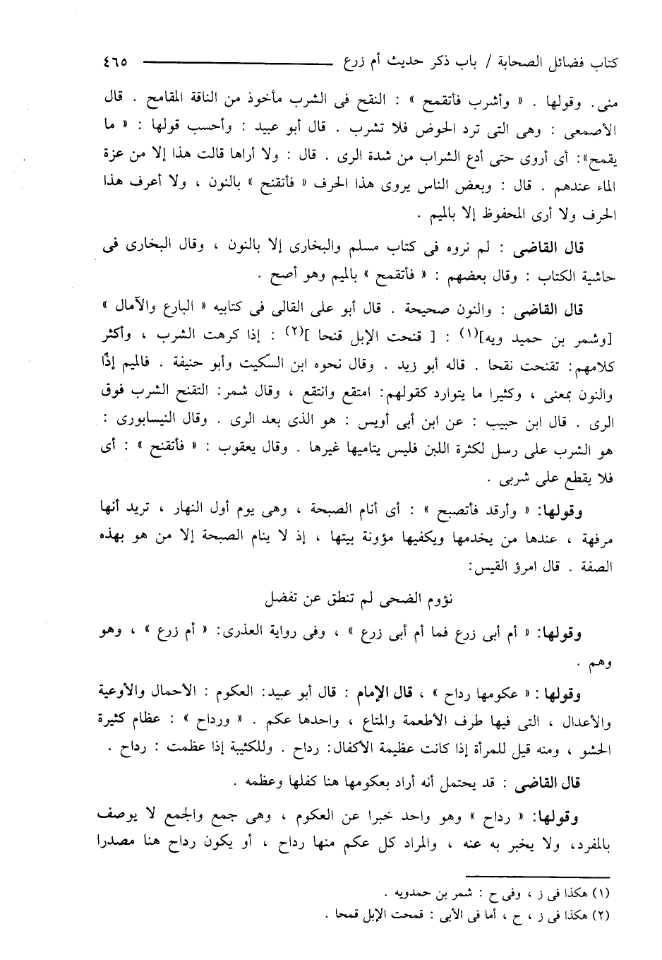 قال القاضى: والنون صحيحة. قال أبو على القالى فى كتابيه " البارع والآمال، [وشمر بن حميد ويه] (¬1): [قنحت الإبل قنحاً] (¬2): إذا كرهت الشرب، وأكثر كلامهم: تقنحت نقحاً. قاله أبو زيد. وقال نحوه ابن السكيت وأبو حنيفة. فالميم إذًا والنون بمعنى، وكثيراً ما يتوارد كقولهم: امتقع وانتقع، وقال شمر: التقنح الشرب فوق الرى. قال ابن حبيب: عن ابن أبى أويس: هو الذى بعد الرى. وقال النيسابورى: هو الشرب على رسل لكثرة اللبن فليس يتاميها غيرها. وقال يعقوب: " فاتقنح ": أى فلا يقطع على شربى.