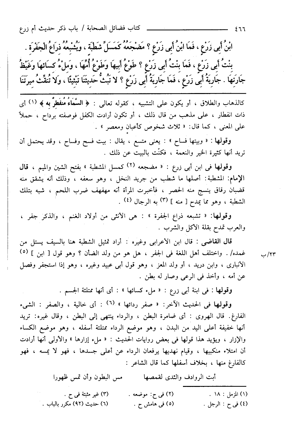 ابْنُ أَبِى زَرْعٍ، فَمَا ابْنُ أَبِى زَرْعٍ؟ مَضْجَعُهُ كَمَسَلِّ شَطْبَةٍ، وَيُشْبِعُهُ ذِرَاعُ الْجَفْرَةِ. بِنْتُ أَبِى زَرْعٍ، فَمَا بِنْتُ أَبِى زَرْعٍ؟ طَوْعُ أَبِيهَا وَطَوْعُ أُمِّهَا، وَمِلْءُ كِسَائهَا وَغَيْظُ جَارَتِهَا. جَارِيَةُ أَبِى زَرْعٍ، فَمَا جَارِيَةُ أَبِى زَرْعٍ؟ لا تَبُثُّ حَدِيثَنَا تَبْثِيثًا، وَلاَ تُنقِّثُ مِيرَتَنَا