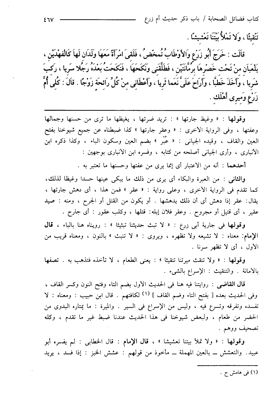 وقولها: " وغيظ جارتها ": تريد ضرتها، يغيظها ما ترى من حسنها وجمالها وعفتها، وفى الرواية الأخرى: " وعقر جارتها " كذا ضبطناه عن جميع شيوخنا بفتح العين والقاف، وقيده الجيانى: " عُبْر " بضم العين وسكون الباء، وكذا ذكره ابن الأنبارى، وأرى الجيانى أصلحه من كتابه، وفسره ابن الأنبارى بوجهين: