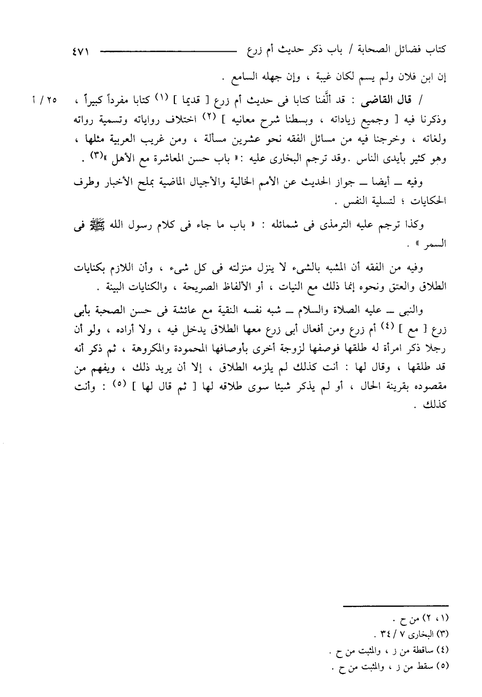 قال القاضى: قد ألَّفنا كتاباً فى حديث أم زرع [قديماً] (¬1) كتابا مفرداً كبيراً، وذكرنا فيه [وجميع زياداته، وبسطنا شرح معانيه] (¬2) اختلاف رواياته وتسمية رواته ولغاته، وخرجنا فيه من مسائل الفقه نحو عشرين مسألة، ومن غريب العربية مثلها، وهو كثير بأيدى الناس. وقد ترجم البخارى عليه: " باب حسن المعاشرة مع الأهل " (¬3).