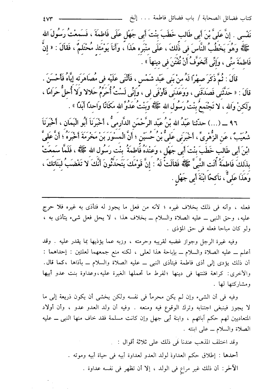 96 - (...) حدّثنا عَبْدُ اللهِ بْنُ عَبْدِ الرَّحْمَنِ الدَّارِمِىُّ، أَخْبَرَنَا أَبُو الْيَمَانِ، أَخْبَرَنَا شُعَيْبٌ، عَنِ الزُّهْرِىِّ، أَخْبَرَنِى عَلِىُّ بْنُ حُسَيْنٍ؛ أَنَّ الْمِسْوَرَ بَنْ مَخْرَمَةَ أَخْبَرَهُ؛ أَنَّ عَلِىَّ ابْنَ أَبِى طَالِبٍ خَطَبَ بِنْتَ أَبِى جَهْلٍ، وَعِنْدَهُ فَاطِمَةُ بِنْتِ رَسُولِ اللهِ صَلَّى اللَّهُ عَلَيْهِ وَسَلَّمَ، فَلَمَّا سَمِعَتْ بِذَلِكَ فَاطِمَةُ أَتَتِ النَّبِىَّ صَلَّى اللَّهُ عَلَيْهِ وَسَلَّمَ فَقَالَتْ لَهُ: إِنَّ قَوْمَكَ يَتَحَدَّثونَ أَنَّ لا تَغْضَبُ لِبَنَاتِكَ، وَهَذَا عَلِىٌّ، نَاكِحًا ابْنَةَ أَبِى جَهْلٍ.
