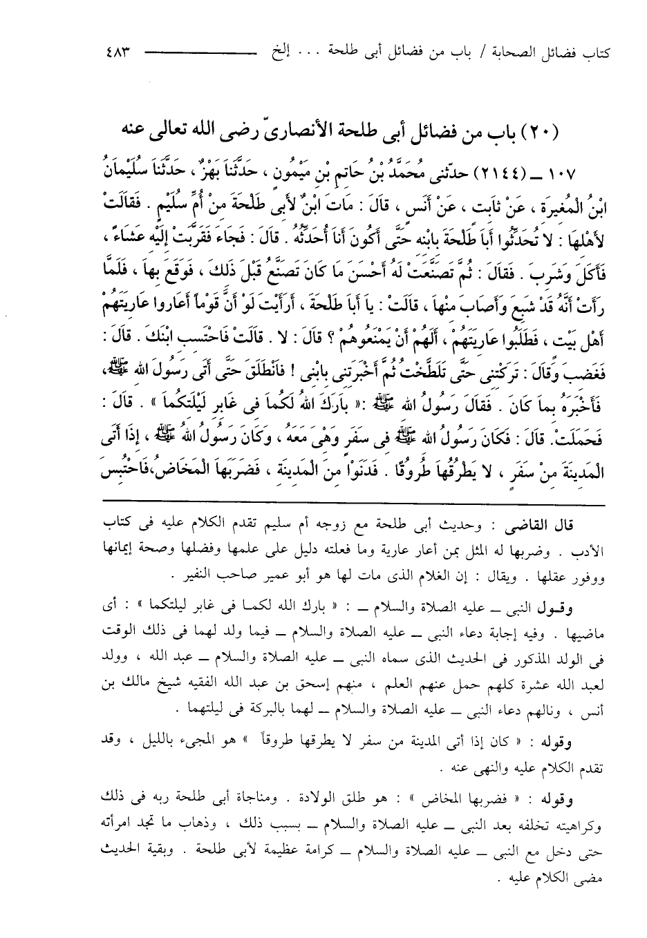 107 - (2144) حدّثنى مُحَمَّدُ بْنُ حَاتِمِ بْنِ مَيْمُونٍ، حَدَّثَنَا بَهْزٌ، حَدَّثَنَا سُلَيْمَانُ ابْنُ الْمُغِيرَةِ، عَنْ ثَابِتٍ، عَنْ أَنَسٍ، قَالَ: مَاتَ ابْنٌ لأَبِى طَلْحَةَ مِنْ أُمِّ سُلَيْمٍ. فَقَالَتْ لأَهْلِهَا: لا تُحَدِّثُوا أَبَا طَلْحَةَ بِابْنِهِ حَتَّى أَكُونَ أَنَا أُحَدِّثُهُ. قَالَ: فَجَاءَ فَقَرَّبَتْ إِلَيْهِ عَشَاءً، فَأَكَلَ وَشَرِبَ. فَقَالَ: ثُمَّ تَصَنَّعَتْ لَهُ أَحْسَنَ مَا كَانَ تَصَنَّعُ قَبْلَ ذَلِكَ، فَوَقَعَ بِهَا، فَلَمَّا رَأَتْ أَنَّهُ قَدْ شَبِعَ وَأَصَابَ مِنْهَا، قَالَتْ: يَا أَبَا طَلْحَةَ، أَرَأَيْتَ لَوْ أَنَّ قَوْمًا أَعَاروا عَارِيَتَهُمْ أَهْل بَيْتٍ، فَطَلَبُوا عَارِيَتَهُمْ، أَلَهُمْ أَنْ يَمْنَعُوهُمْ؟ قَالَ: لا. قَالَتْ فَاحْتَسِبِ ابْنَكَ. قَالَ: فَغَضِبَ وَقَالَ: تَرَكْتِنِى حَتَّى تَلَطَّخْتُ ثُمَّ أَخْبَرَتِنِى بِابْنِى! فاَنْطَلَقَ حَتَّى أَتَى رَسُولَ اللهِ صَلَّى اللَّهُ عَلَيْهِ وَسَلَّمَ، فَأَخْبَرَهُ بِمَا كَانَ. فَقَالَ رَسُولُ الله صَلَّى اللَّهُ عَلَيْهِ وَسَلَّمَ: " باَرَكَ اللهُ لَكُمَا فِى غَابِرِ لَيْلَتِكُمَا ". قَالَ: فَحَمَلَتْ. قَالَ: فَكَانَ رَسُولُ اللهِ صَلَّى اللَّهُ عَلَيْهِ وَسَلَّمَ فِى سَفَرٍ وَهِىَ مَعَهُ، وَكَانَ رَسُولُ اللهُ صَلَّى اللَّهُ عَلَيْهِ وَسَلَّمَ، إِذَا أَتَى الْمَدِينَةَ مِنْ سَفَرٍ، لا يَطْرُقُهَا طُروُقًا. فَدَنَوْا مِنَ الْمَدِينَةِ، فَضَرَبَهَا الْمَخَاضُ، فَاحْتُبِسَ