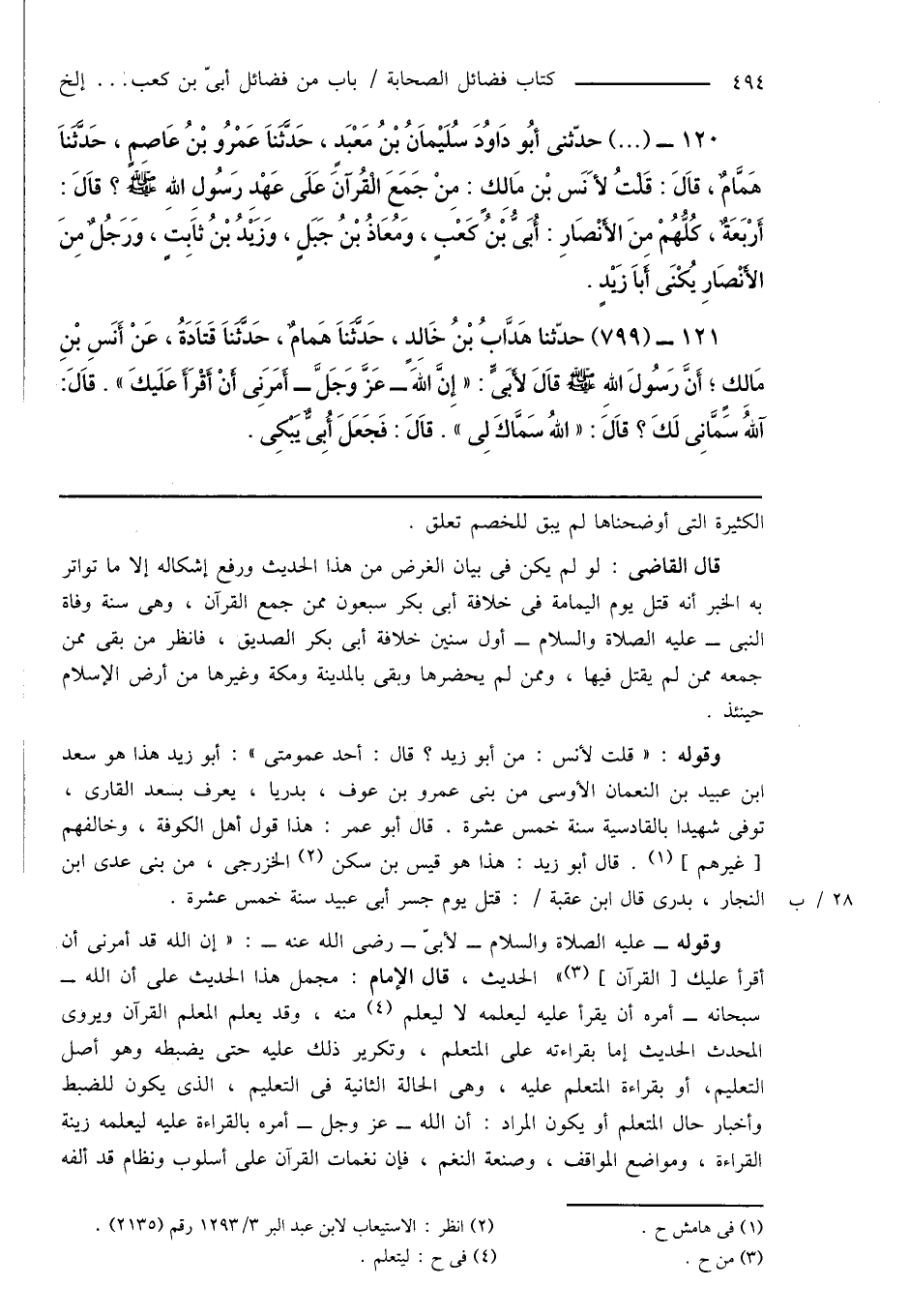 121 - (799) حدّثنا هَدَّابُ بْنُ خَالِدٍ، حَدَّثَنَا هَمَّامٌ، حَدَّثَنَا قَتَادَةُ، عَنْ أَنَسِ بْنِ مَالِكٍ؛ أَنَّ رَسُولَ اللهِ صَلَّى اللَّهُ عَلَيْهِ وَسَلَّمَ قَالَ لأُبَىٍّ: " إِنَّ الله - عَزَّ وَجَلَّ - أَمَرَنِى أَنْ أَقْرَأَ عَلَيكَ ". قَالَ: آللهُ سَمَّانِى لَكَ؟ قَالَ: " اللهُ سَمَّاكَ لِى ". قَالَ: فَجَعَلَ أُبِىٌّ يَبْكِى.