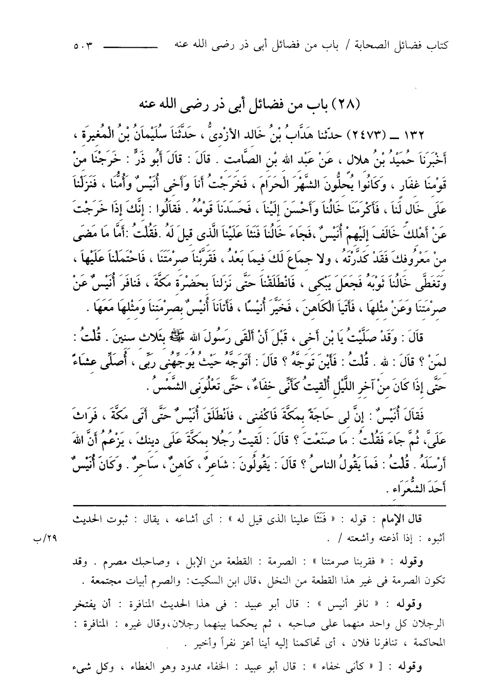 132 - (2473) حدّثنا هَدَّابُ بْنُ خَالِد الأزْدِىُّ، حَدَّثَنَا سُلَيْمَانُ بْنُ الْمُغِيرَةِ، أَخْبَرَنَا حُمَيْدُ بْنُ هِلالٍ، عَنْ عَبْدِ اللهِ بْنِ الصَّامِتِ. قَالَ: قَالَ أَبُو ذَرٍّ: خَرَجْنَا منْ قَوْمِنَا غِفَارٍ، وَكَانُوا يُحَلُّونَ الشَّهْرَ الْحَرَامَ، فَخَرَجْتُ أَناَ وَأَخِى أُنَيْسٌ وَأُمُّنَا، فَنَزَلْنَا عَلَى خَالٍ لَنَا، فَأَكْرَمَنَا خَالُنَا وَأَحْسَنَ إِلَيْنَا، فَحَسَدَنَا قَوْمُهُ. فَقاَلُوا: إِنَّكَ إِذَا خَرَجْتَ عَنْ أَهْلِكَ خَالَفَ إِلَيْهِمْ أُنَيْسٌ، فَجَاءَ خَالُنَا فَنَثَا عَلَيْنَا الَّذِى قِيلَ لَهُ. فَقُلْتُ: أَمَّا مَا مَضَى مِنْ مَعْرُوفِكَ فَقَدْ كَدَّرْتَهُ، ولا جِمَاعَ لَكَ فِيمَا بَعْدُ، فَقَرَّبْنَا صِرْمَتَنَا، فَاحْتَمَلْناَ عَلَيْهَا، وَتَغَطَّى خَالُنَا ثَوْبَهُ فَجَعَلَ يَبْكِى، فَانْطَلَقْنَا حَتَّى نَزَلنَا بِحَضْرَةِ مَكَّةَ، فَنافَرَ أُنَيْسٌ عَنْ صِرْمَتِنَا وَعَنْ مِثْلِهَا، فَأَتَيَا الْكَاهِنَ، فَخَيَّرَ أُنيْسًا، فَأَتاَنَا أُنيْسٌ بِصِرْمَتِنَا وَمِثْلِهَا مَعَهَا.