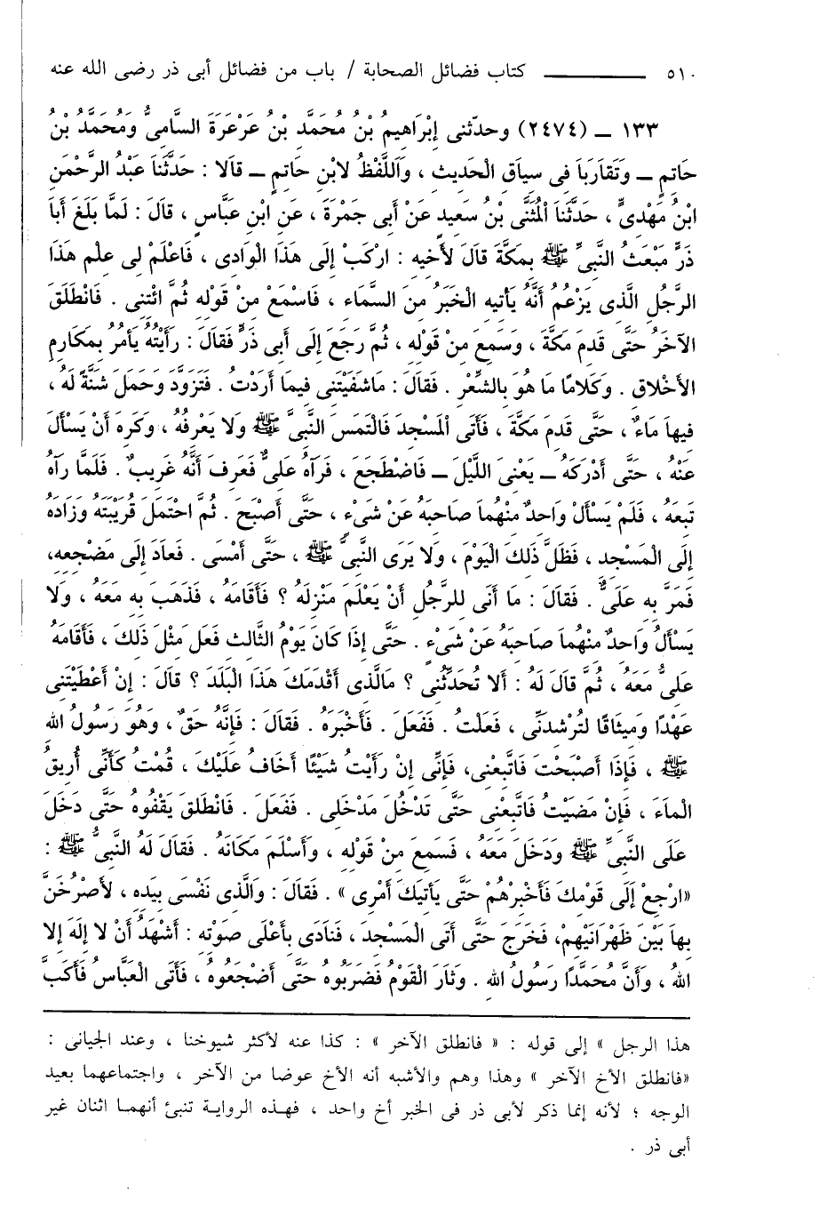 133 - (2474) وحدّثنى إِبْرَاهِيمُ بْنُ مُحَمَّدِ بْنُ عَرْعَرَةَ السَّامِىُّ وَمُحَمَّدُ بْنُ حَاتِمٍ - وَتَقَارَبَا فِى سِيَاقِ الْحَدِيثِ، وَاَللَّفْظُ لابْنِ حَاتِمٍ - قَالا: حَدَّثَنَا عَبْدُ الرَّحْمَنِ ابْنُ مَهْدِىٍّ، حَدَّثَنَا الْمُثَنَّى بْنُ سَعِيدٍ عَنْ أَبِى جَمْرَةَ، عَنِ ابْنِ عَبَّاسٍ، قَالَ: لَمَّا بَلَغَ أَبَا ذَرٍّ مَبْعَثُ النَّبِىِّ صَلَّى اللَّهُ عَلَيْهِ وَسَلَّمَ بِمَكَّةَ قَالَ لأَخِيهِ: ارْكَبْ إِلَى هَذَا الْوَادِى، فَاعْلَمْ لِى عِلْم هَذَا الرَّجُلِ الَّذِى يَزْعُمُ أَنَّهُ يَأتِيهِ الْخَبَرُ مِنَ السَّمَاءِ، فَاسْمَعْ مِنْ قَوْلِهِ ثُمَّ ائْتِنِى. فَانْطَلَقَ الآخَرُ حَتَّى قَدِمَ مَكَّةَ، وَسَمِعَ مِنْ قَوْلِهِ، ثُمَّ رَجَعَ إِلَى أَبِى ذَرٍّ فَقَالَ: رَأَيْتُهُ يَأمُرُ بِمَكَارِمِ الأَخْلاقِ. وَكَلامًا مَا هُوَ بِالشِّعْرِ. فَقَالَ: مَا شَفَيْتَنِى فِيمَا أَرَدْتُ. فَتَزَوَّدَ وَحَمَلَ شَنَّةَ لَهُ، فِيهَا مَاءٌ، حَتَّى قَدِمَ مَكَّةَ، فَأَتَى الْمَسْجِدَ فَالْتَمَسَ النَّبِىَّ صَلَّى اللَّهُ عَلَيْهِ وَسَلَّمَ وَلا يَعْرِفُهُ، وَكَرِهَ أَنْ يَسْأَلَ عَنْهُ، حَتَّى أَدْرَكَهُ - يَعْنِى اللَّيْلَ - فَاضْطَجَعَ، فَرَآهُ عَلِىٌّ فَعَرِفَ أَنَّهُ غَرِيبٌ. فَلَمَّا رَآهُ تَبِعَهُ، فَلَمْ يَسْأَلْ وَاحِدٌ مِنْهُمَا صَاحِبَهُ عَنْ شَىْءٍ، حَتَّى أَصْبَحَ. ثُمَّ احْتَمَلَ قُرَيْبَتَهُ وَزَادَهُ إِلَى الْمَسْجِدِ، فَظَلَّ ذَلِكَ الْيَوْمَ، وَلا يَرَى النَّبِىَّ صَلَّى اللَّهُ عَلَيْهِ وَسَلَّمَ، حَتَّى أَمْسَى. فَعَادَ إِلَى مَضْجِعِهِ، فَمَرَّ بِهِ عَلِىٌّ. فَقَالَ: مَا أَنَى لِلرَّجُلِ أَنْ يَعْلَمَ مَنْزِلَهُ؟ فَأَقَامَهُ، فَذَهَبَ بِهِ مَعَهُ، وَلَا يَسْأَلُ وَاحِدٌ مِنْهُمَا صَاحِبَهُ عَنْ شَىْءٍ. حَتَّى إِذَا كَانَ يَوْمُ الثَّالِثِ فَعَلَ مِثْلَ ذَلِكَ، فَأَقَامَهُ عَلِىُّ مَعَهُ، ثُمَّ قَالَ لَهُ: أَلا تُحَدِّثُنِى؟ مَالَّذِى أَقْدَمَكَ هَذَا الْبَلَدَ؟ قَالَ: إِنْ أَعْطَيْتَنِى عَهْدًا وَمِيثَاقًا لتُرْشِدَنِّى، فَعَلْتُ. فَفَعَلَ. فَأَخْبَرَهُ. فَقَالَ: فَإِنَّهُ حَقٌّ، وَهُوَ رَسُولُ اللهِ صَلَّى اللَّهُ عَلَيْهِ وَسَلَّمَ، فَإِذَا أَصْبَحْتَ فَاتَّبِعْنِى، فَإِنِّى إِنْ رَأَيْتُ شَيْئًا أَخَافُ عَلَيْكَ، قُمْتُ كَأَنِّى أُرِيقُ الْمَاءَ، فَإِنْ مَضَيْتُ فَاتَّبِعْنِى حَتَّى تَدْخُلَ مَدْخَلِى. فَفَعَلَ. فَانْطَلقَ يَقْفُوهُ حَتَّى دَخَلَ عَلَى النَّبِىِّ صَلَّى اللَّهُ عَلَيْهِ وَسَلَّمَ وَدَخَلَ مَعَهُ، فَسَمِعَ مِنْ قَوْلِهِ، وَأَسْلَمَ مَكَانَهُ. فَقَالَ لَهُ النَّبىُّ صَلَّى اللَّهُ عَلَيْهِ وَسَلَّمَ: " ارْجِعْ إِلَى قَوْمِكَ فَأَخْبِرْهُمْ حَتَّى يَأتِيَكَ أَمْرِى ". فَقَالَ: وَالَّذِى نَفْسَى بِيَدِهِ، لَأَصْرُخَنَّ بِهَا بَيْنَ ظَهْرَانَيْهِمْ، فَخَرَجَ حَتَّى أَتَى الْمَسْجِدَ، فَنَادَى بِأَعْلَى صَوْتِهِ: أَشْهَدُ أَنْ لا إِلَهَ إلا اللهُ، وَأَنَّ مُحَمَّدًا رَسُولُ اللهِ. وَثَارَ الْقَوْمُ فَضَرَبُوهُ حَتَّى أَضْجَعُوهُ، فَأَتَى الْعَبَّاسُ فَاكَبَّ