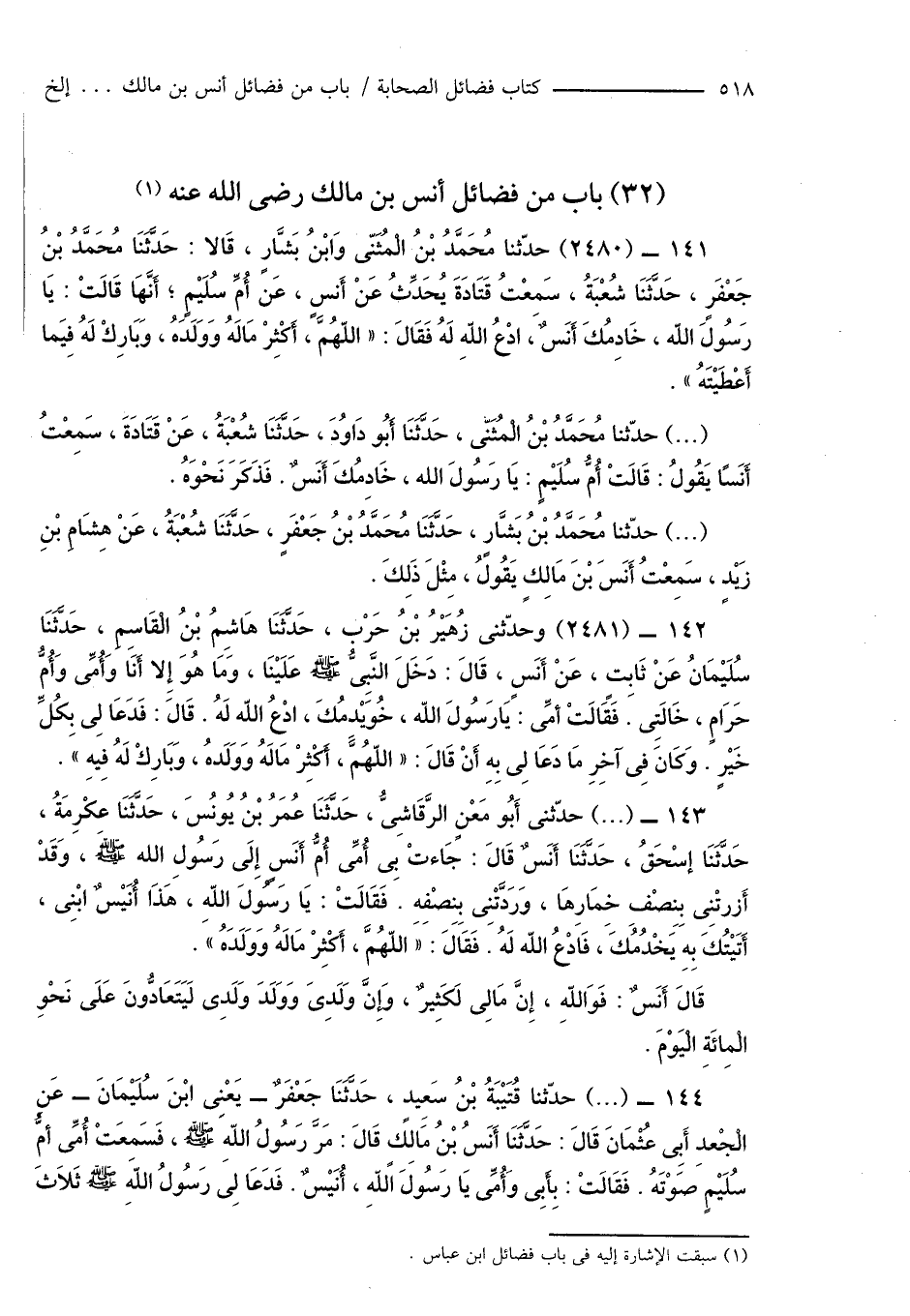 141 - (2480) حدّثنا مُحَمَّدُ بْنُ الْمُثَنّى وَابْنُ بَشَّارٍ، قَالا: حَدَّثَنَا مُحَمَّدُ بْنُ جَعْفَرٍ، حَدَّثَنَا شُعْبَةُ، سَمِعْتُ قَتَادَةَ يُحَدِّثُ عَنْ أَنَسٍ، عَن أُمِّ سُلَيْمٍ؛ أَنَّهَا قَالَتْ: يَا رَسُولَ الله، خَادِمُكَ أَنَسٌ، ادْعُ الله لَهُ فَقَالَ: " اللهُمَّ، أَكْثِرْ مَالَهُ وَوَلَدَهُ، وَبَارِكْ لَهُ فِيَما أَعْطَيْتَهُ ".