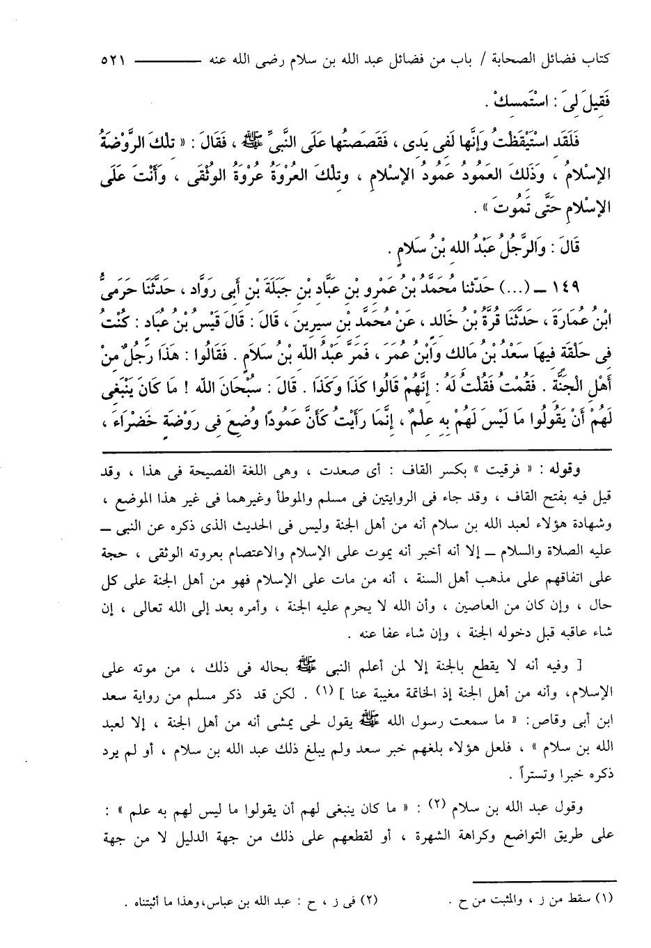 149 - (...) حَدّثنا مُحَمَّدُ بْنُ عَمْرِو بْنِ عَبَّادِ بْنِ جَبَلَةَ بْنِ أَبِى رَوَّاد، حَدَّثَنَا حَرَمىُّ ابْنُ عُمَارَةَ، حَدَّثَنَا قُرَّةُ بْنُ خَالِدٍ، عَنْ مُحَمَّدِ بْنِ سِيرِينَ، قَالَ: قَالَ قَيْسُ بْنُ عُبَادٍ: كُنْتُ فِى حَلْقَةٍ فِيهَا سَعْدُ بْنُ مَالِكٍ وَابْنُ عُمَرَ، فَمَرَّ عَبْدُ اللهِ بْنُ سَلاَمٍ. فَقَالُوا: هَذَا رَجُلٌ مِنْ أَهْلِ الْجَنَّةَ. فَقُمْتُ فَقُلْتُ لَهُ: إِنَّهُمْ قَالُوا كَذَا وَكَذَا. قَالَ: سُبْحَانَ الله! مَا كَانَ يَنْبَغِى لَهُمْ أَنْ يَقُولُوا مَا لَيْسَ لَهُمْ بِهِ عِلْمٌ، إِنَّمَا رَأَيْتُ كَأَنَّ عَمُودًا وُضِعَ فِى رَوْضَةٍ خَضْرَاءَ،