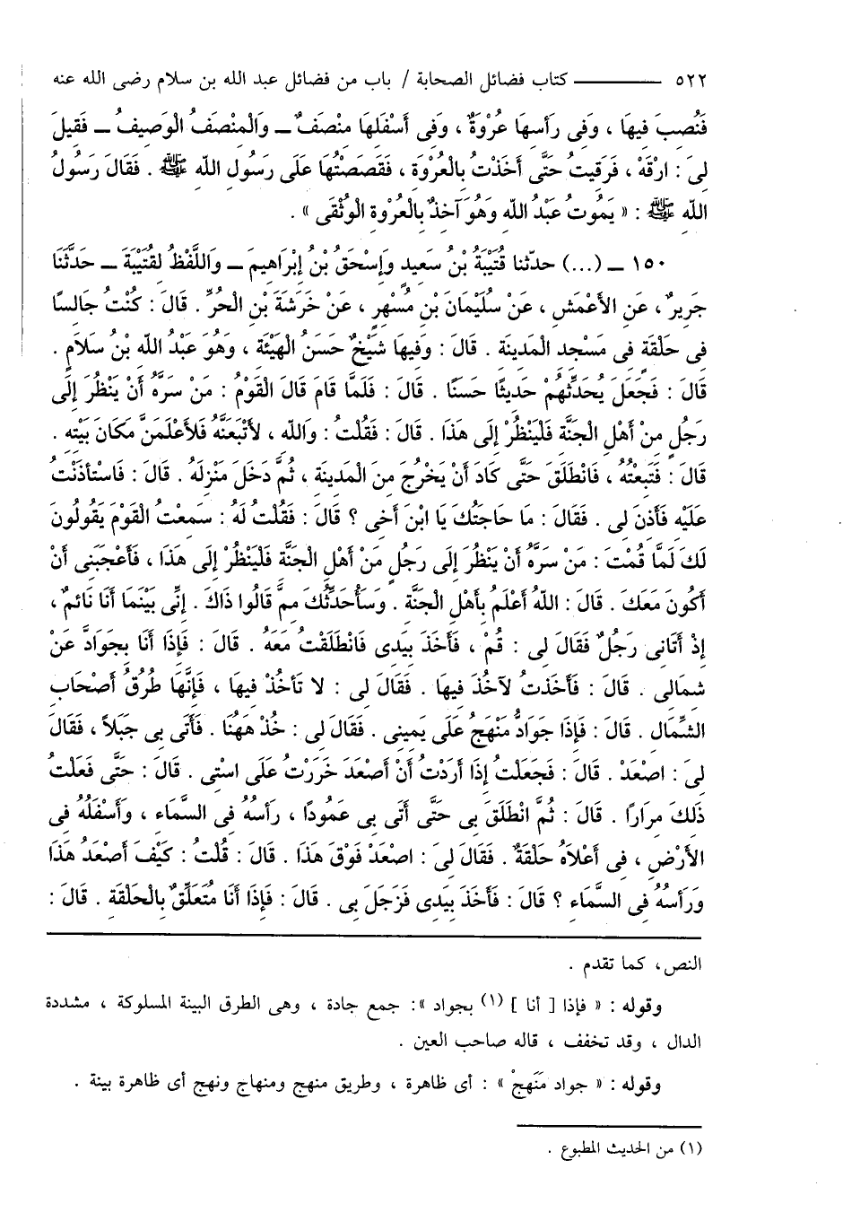 150 - (...) حدّثنا قُتَيْبَةُ بْنُ سَعِيدٍ وَإِسْحَاقُ بْنُ إِبْرَاهِيمَ - وَاللَّفْظُ لِقُتَيْبَةَ - حَدَّثَنَا جَرِيرٌ، عَنِ الأَعْمَشِ، عَنْ سُلَيْمَانَ بْنِ مُسْهِرٍ، عَنْ خَرَشَةَ بنِ الْحُرِّ. قَالَ: كُنْتُ جَالِسًا فِى حَلْقَةٍ فِى مَسْجدِ الْمَدِينَةِ. قَالَ: وَفِيهَا شَيْخٌ حَسَنُ الْهَيْئَةِ، وَهُوَ عَبْدُ اللهِ بْنُ سَلامٍ. قَالَ: فَجَعَلَ يُحَدِّثهُمْ حَدِيثًا حَسَنًا. قَالَ: فَلَمَّا قَامَ قَالَ الْقَوْمُ: مَنْ سَرَّهُ أَنْ يَنْظُرَ إِلَى رَجُلٍ مِنْ أَهْلِ الْجَنَّةِ فَلْيَنْظُرْ إِلَى هَذَا. قَالَ: فَقُلْتُ: وَاللهِ، لأَتْبَعَنَّهُ فَلأَعْلَمَنَّ مَكَانَ بَيْتِهِ. قَالَ: فَتَبِعْتُهُ، فَانْطَلَقَ حَتَّى كَادَ أَنْ يَخْرُجَ مِنَ الْمَدِينَةِ، ثُمَّ دَخَلَ مَنْزِلَهُ. قَالَ: فَاسْتأذَنْتُ عَلَيْهِ فَأَذِنَ لِى. فَقَالَ: مَا حَاجَتُكَ يَا ابْنَ أَخِى؟ قَالَ: فَقُلْتُ لَهُ: سَمِعْتُ الْقَوْمَ يَقُولُونَ لَكَ لَمَّا قُمْتَ: مَنْ سَرَّهُ أَنْ يَنْظُرَ إِلَى رَجُلٍ مَنْ أَهْلِ الْجَنَّةِ فَلْيَنْظُرْ إِلَى هَذَا، فَأَعْجَبَنِى أَنْ أَكُونَ مَعَكَ. قَالَ: اللهُ أَعْلَمُ بِأَهْلِ الْجَنَّةِ. وَسَأُحَدِّثُكَ مِمَّ قَالُوا ذَاكَ. إِنِّى بَيْنَمَا أَنَا نَائِمٌ، إِذْ أَتَانِى رَجُلٌ فَقَالَ لِى: قُمْ، فَأَخَذَ بِيَدِى فَانْطَلَقْتُ مَعَهُ. قَالَ: فَإِذَا أَنَا بِجَوَادَّ عَنْ شِمَالِى. قَالَ: فَأَخَذتُ لآخُذَ فِيهَا. فَقَاَلَ لِى: لا تَأخُذْ فِيهَا، فَإِنَّهَا طُرُقُ أَصْحَابِ الشِّمَالِ. قَالَ: فَإِذَا جَوَادُّ مَنْهَجُ عَلَى يَمِينِى. فَقَالَ لِى: خُذْ هَهُنَا. فَأَتَى بِى جَبَلاً، فَقَالَ لِىَ: اصْعَدْ. قَالَ: فَجَعَلْتُ إِذَا أَرَدْتُ أَنْ أَصْعَدَ خَرَرْتُ عَلَى اسْتِى. قَالَ: حَتَّى فَعَلْتُ ذَلِكَ مِرَارًا. قَالَ: ثُمَّ انْطَلَقَ بِى حَتَّى أَتَى بِى عَمُودًا، رَأسُهُ فِى السَّمَاءِ، وَأَسْفَلُهُ فِى الأَرْضِ، فِى أَعْلاَهُ حَلْقَةٌ. فَقَالَ لِىَ: اصْعَدْ فَوْقَ هَذَا. قَالَ: قُلْتُ: كَيْفَ أَصْعَدُ هَذَا وَرَأسُهُ فِى السَّمَاءِ؟ قَالَ: فَأَخَذَ بِيَدِى فَزَجَلَ بِى. قَالَ: فَإِذَا أَنَا مُتَعَلِّقٌ بِالْحَلْقَةِ. قَالَ:
