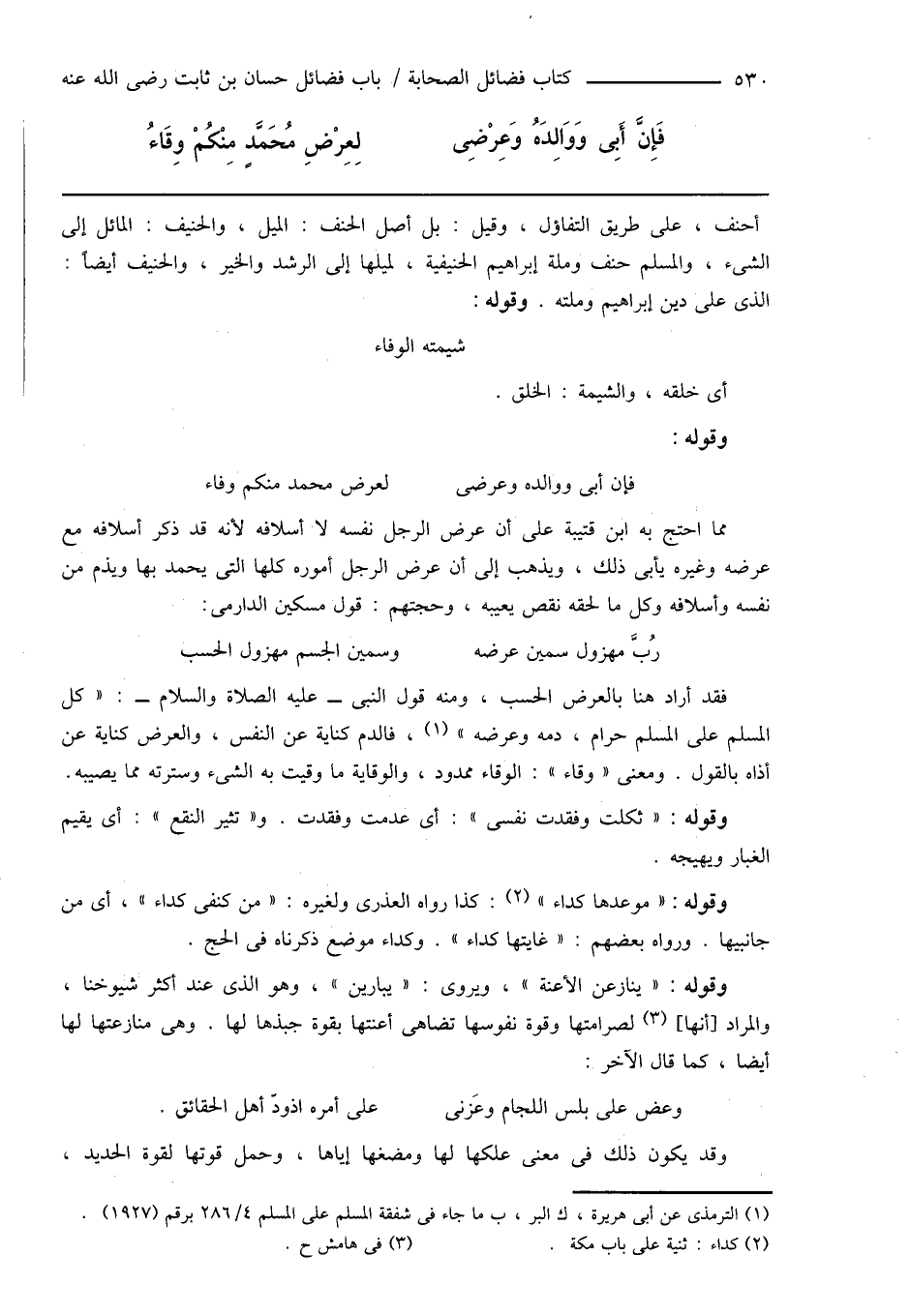 فَإِنَّ أَبِى وَوَالِدَهُ وَعِرْضِى ... لِعِرْضِ مُحَمَّدٍ مِنْكُمْ وِقَاءُ