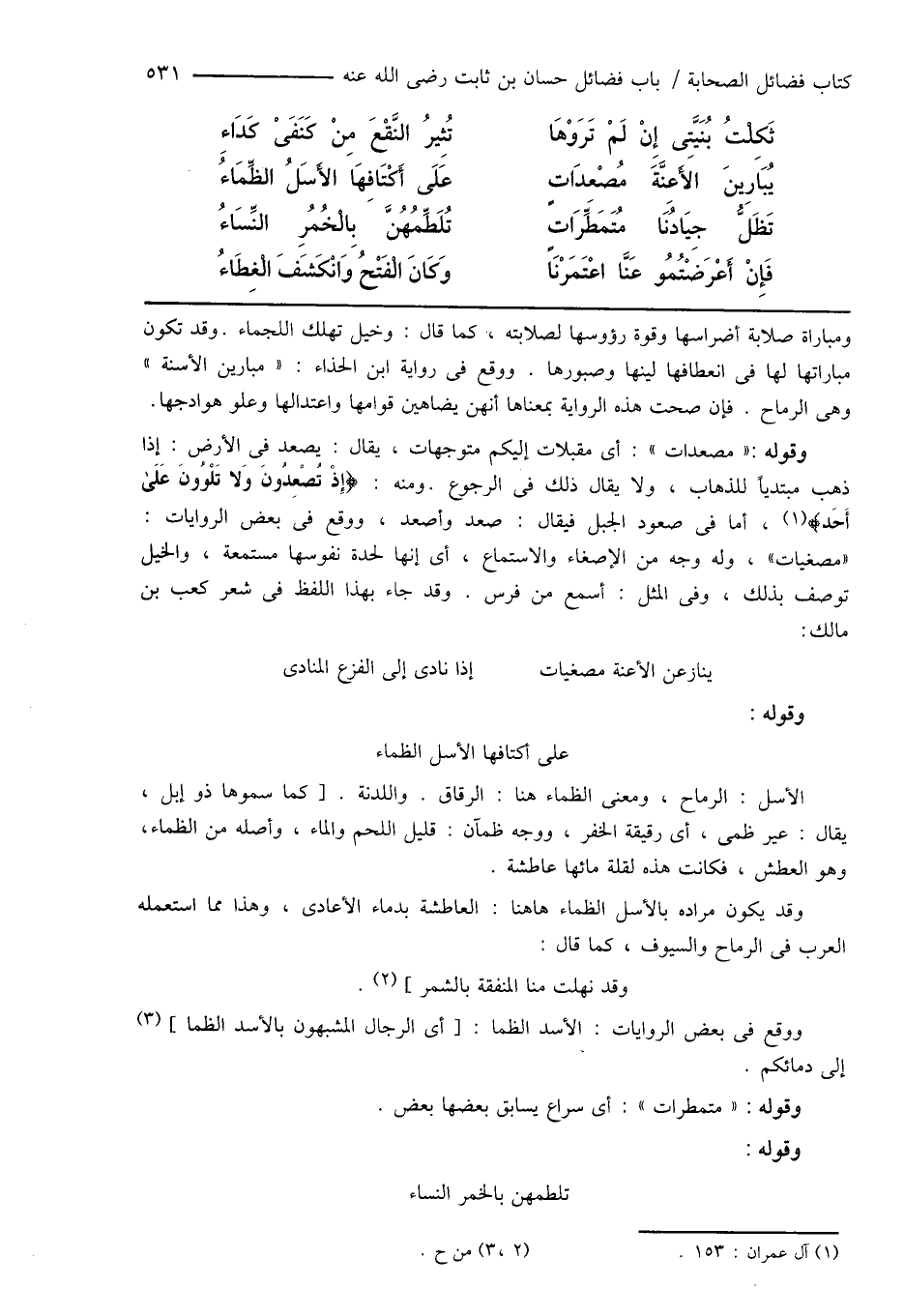 يُبَاَرِينَ الأَعِنَّةَ مُصْعِدَاتٍ ... عَلَى أَكْتَافِهَا الأَسَلُ الظِّمَاءُ