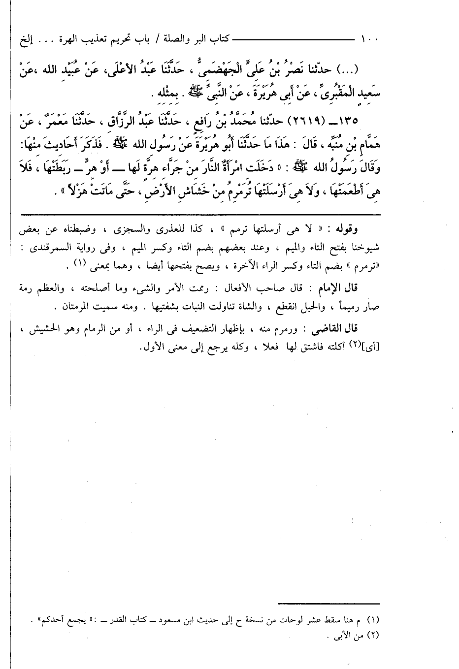 135 - (2619) حَدَّثَنَا مُحَمَّدُ بْنُ رَافِعٍ، حَدَّثَنَا عَبْدُ الرَّزَّاقِ، حَدَّثَنَا مَعْمَرٌ، عَنْ هَمَّامِ بْنِ مُنَبِّهٍ، قَالَ: هَذَا مَا حَدَّثَنَا أَبُو هُرَيْرَةَ عَنْ رَسُولِ اللَّهِ صَلَّى اللَّهُ عَلَيْهِ وَسَلَّمَ. فَذَكَرَ أَحَادِيثَ مِنْهَا: وَقَالَ رَسُولُ اللَّهِ صَلَّى اللَّهُ عَلَيْهِ وَسَلَّمَ: " دَخَلَتْ امْرَأَةٌ النَّارَ مِنْ جَرَّاءِ هِرَّةٍ لَهَا - أَوْ هِرٍّ - رَبَطَتْهَا، فَلَا هِىَ أَطْعَمَتْهَا، وَلَا هِىَ أَرْسَلَتْهَا تُرَمْرِمُ مِنْ خَشَاشِ الْأَرْضِ، حَتَّى مَاتَتْ هَزْلًا ".