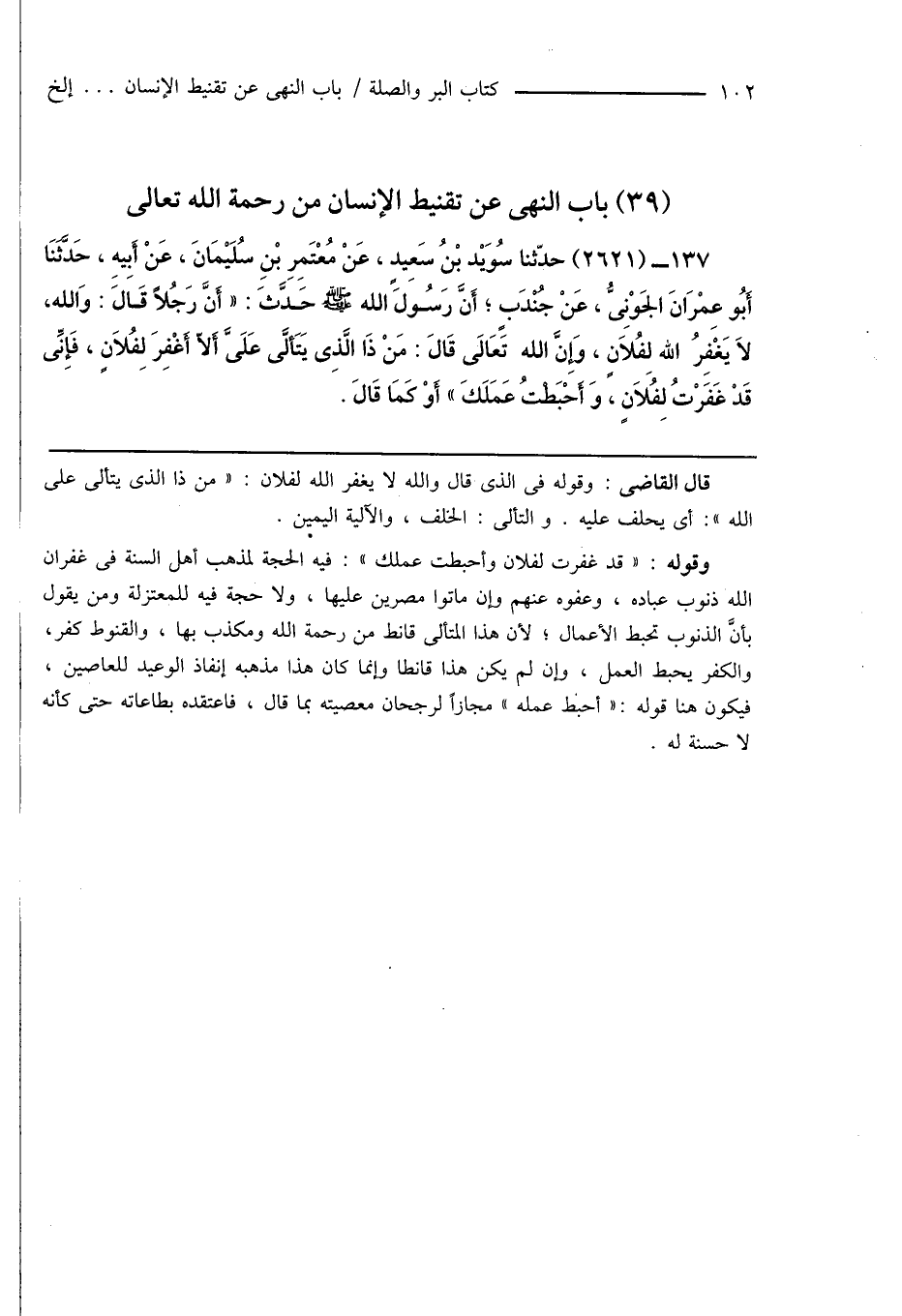 137 - (2621) حَدَّثَنَا سُوَيْدُ بْنُ سَعِيدٍ، عَنْ مُعْتَمِرِ بْنِ سُلَيْمَانَ، عَنْ أَبِيهِ، حَدَّثَنَا أَبُو عِمْرَانَ الْجَوْنِىُّ، عَنْ جُنْدَبٍ؛ أَنَّ رَسُولَ اللَّهِ صَلَّى اللَّهُ عَلَيْهِ وَسَلَّمَ حَدَّثَ: " أَنَّ رَجُلًا قَالَ: وَاللَّهِ، لَا يَغْفِرُ اللَّهُ لِفُلَانٍ، وَإِنَّ اللَّهَ تَعَالَى قَالَ: مَنْ ذَا الَّذِى يَتَأَلَّى عَلَىَّ أَنْ لَا أَغْفِرَ لِفُلَانٍ، فَإِنِّى قَدْ غَفَرْتُ لِفُلَانٍ، وَأَحْبَطْتُ عَمَلَكَ " أَوْ كَمَا قَالَ.