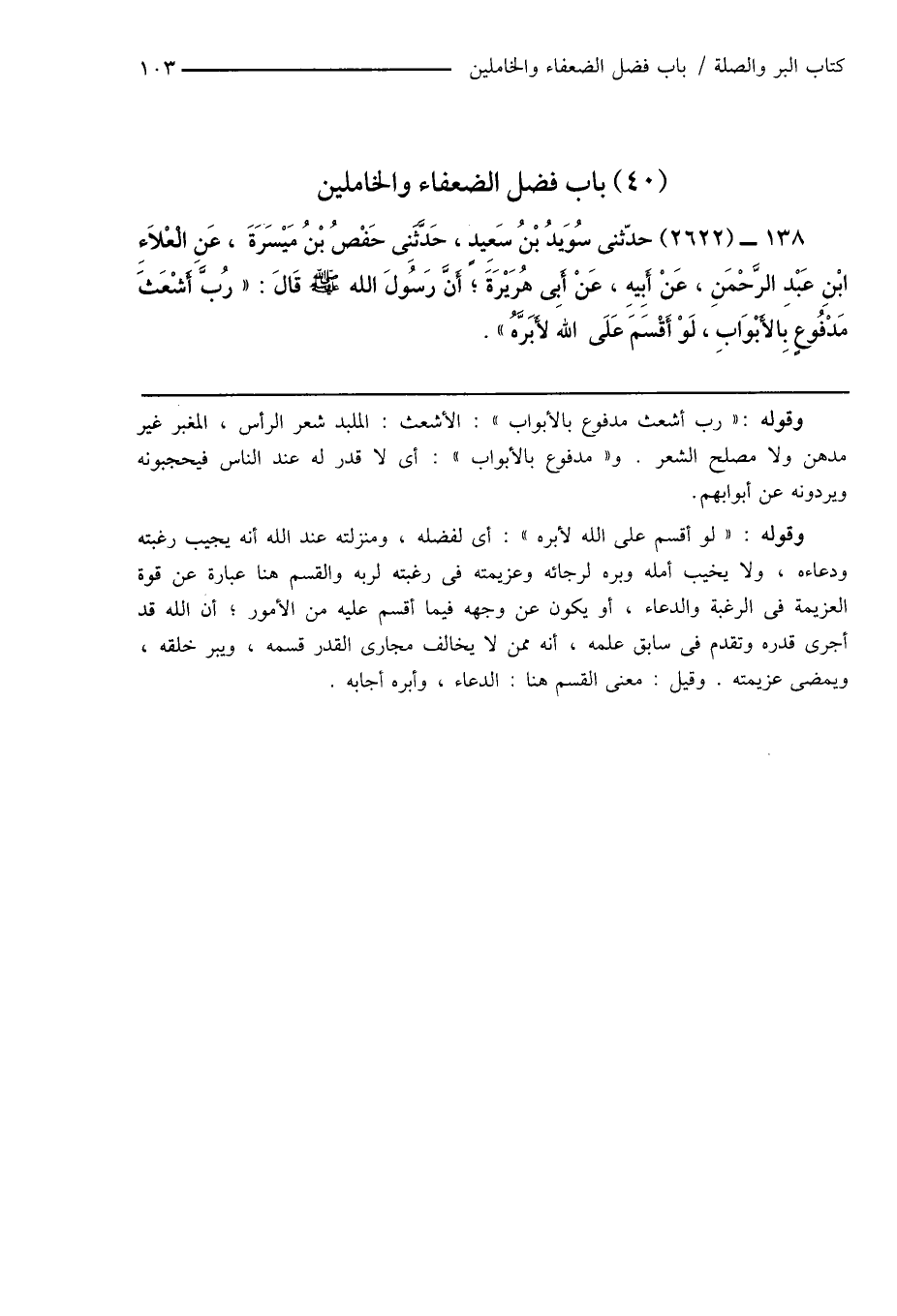 138 - (2622) حَدَّثَنِى سُوَيْدُ بْنُ سَعِيدٍ، حَدَّثَنِى حَفْصُ بْنُ مَيْسَرَةَ، عَنْ الْعَلَاءِ بْنِ عَبْدِ الرَّحْمَنِ، عَنْ أَبِيهِ، عَنْ أَبِى هُرَيْرَةَ؛ أَنَّ رَسُولَ اللَّهِ صَلَّى اللَّهُ عَلَيْهِ وَسَلَّمَ قَالَ: " رُبَّ أَشْعَثَ مَدْفُوعٍ بِالْأَبْوَابِ، لَوْ أَقْسَمَ عَلَى اللَّهِ لَأَبَرَّهُ ".