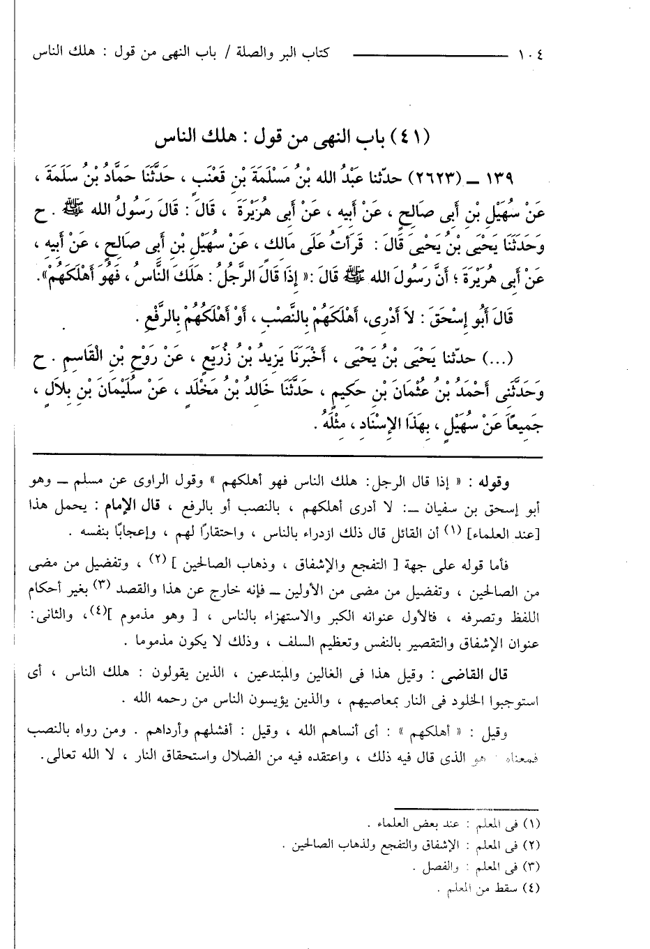 139 - (2623) حَدَّثَنَا عَبْدُ اللَّهِ بْنُ مَسْلَمَةَ بْنِ قَعْنَبٍ، حَدَّثَنَا حَمَّادُ بْنُ سَلَمَةَ، عَنْ سُهَيْلِ بْنِ أَبِى صَالِحٍ، عَنْ أَبِيهِ، عَنْ أَبِى هُرَيْرَةَ، قَالَ: قَالَ رَسُولُ اللَّهِ صَلَّى اللَّهُ عَلَيْهِ وَسَلَّمَ. ح وحَدَّثَنَا يَحْيَى بْنُ يَحْيَى قَالَ: قَرَأْتُ عَلَى مَالِكٍ، عَنْ سُهَيْلِ بْنِ أَبِى صَالِحٍ، عَنْ أَبِيهِ، عَنْ أَبِى هُرَيْرَةَ؛ أَنَّ رَسُولَ اللَّهِ صَلَّى اللَّهُ عَلَيْهِ وَسَلَّمَ قَالَ: " إِذَا قَالَ الرَّجُلُ: هَلَكَ النَّاسُ، فَهُوَ أَهْلَكُهُمْ ".