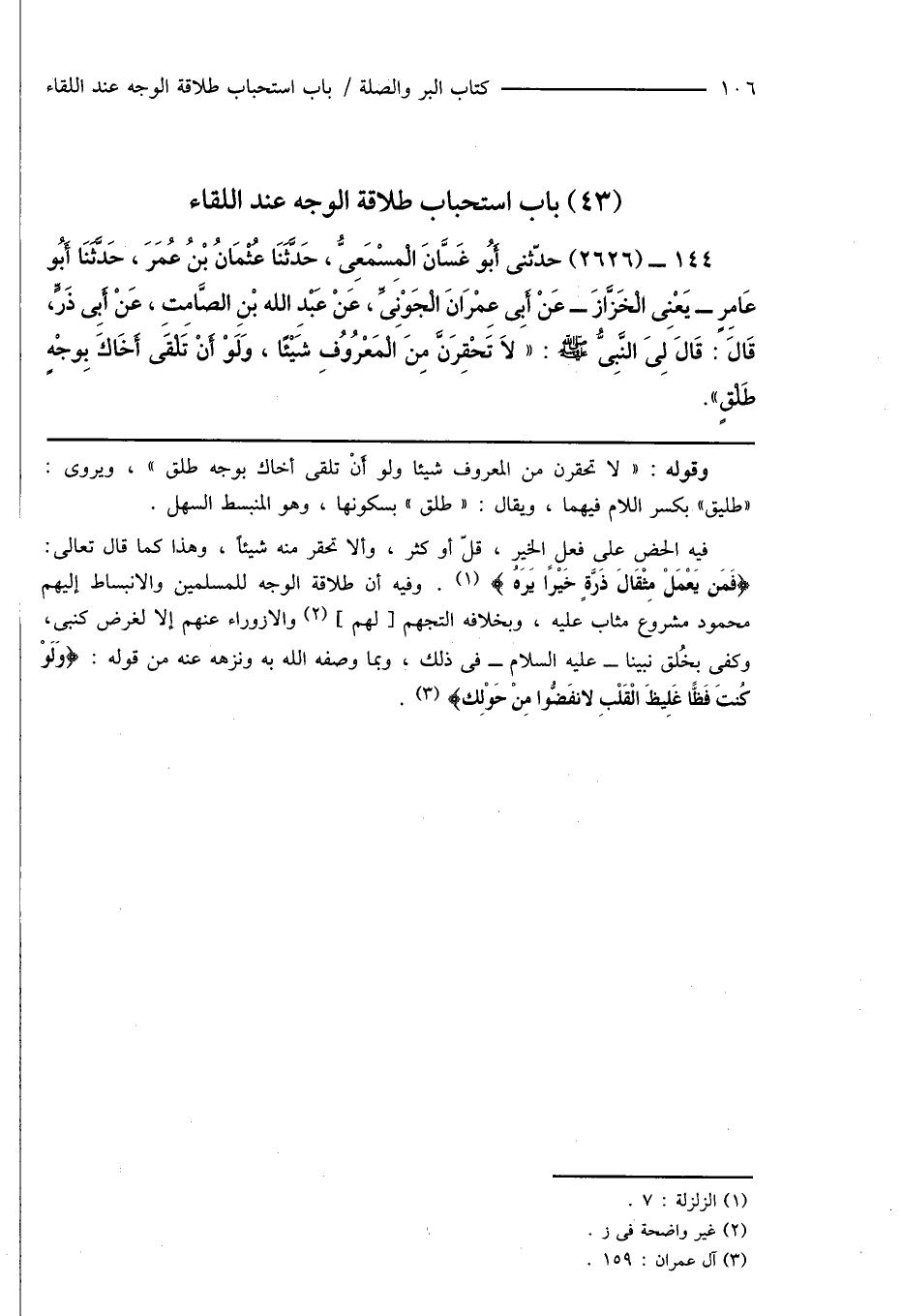 144 - (2626) حَدَّثَنِى أَبُو غَسَّانَ الْمِسْمَعِىُّ، حَدَّثَنَا عُثْمَانُ بْنُ عُمَرَ، حَدَّثَنَا أَبُو عَامِرٍ - يَعْنِى الْخَزَّازَ - عَنْ أَبِى عِمْرَانَ الْجَوْنِىِّ، عَنْ عَبْدِ اللَّهِ بْنِ الصَّامِتِ، عَنْ أَبِى ذَرٍّ قَالَ: قَالَ لِىَ النَّبِىُّ صَلَّى اللَّهُ عَلَيْهِ وَسَلَّمَ: " لَا تَحْقِرَنَّ مِنْ الْمَعْرُوفِ شَيْئًا، وَلَوْ أَنْ تَلْقَى أَخَاكَ بِوَجْهٍ طَلْقٍ ".
