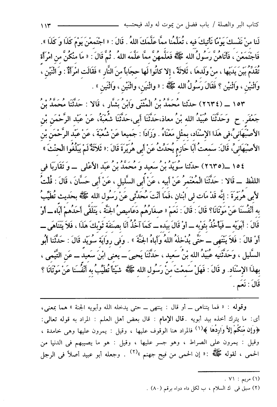 154 - (2635) حَدَّثَنَا سُوَيْدُ بْنُ سَعِيدٍ وَمُحَمَّدُ بْنُ عَبْدِ الْأَعْلَى - وَتَقَارَبَا فِى اللَّفْظِ - قَالَا: حَدَّثَنَا الْمُعْتَمِرُ عَنْ أَبِيهِ، عَنْ أَبِى السَّلِيلِ، عَنْ أَبِى حَسَّانَ، قَالَ: قُلْتُ لِأَبِى هُرَيْرَةَ: إِنَّهُ قَدْ مَاتَ لِىَ ابْنَانِ، فَمَا أَنْتَ مُحَدِّثِى عَنْ رَسُولِ اللَّهِ صَلَّى اللَّهُ عَلَيْهِ وَسَلَّمَ بِحَدِيثٍ تُطَيِّبُ بِهِ أَنْفُسَنَا عَنْ مَوْتَانَا؟ قَالَ: قَالَ: نَعَمْ " صِغَارُهُمْ دَعَامِيصُ الْجَنَّةِ، يَتَلَقَّى أَحَدُهُمْ أَبَاهُ - أَوْ قَالَ: أَبَوَيْهِ - فَيَأْخُذُ بِثَوْبِهِ - أَوْ قَالَ بِيَدِهِ - كَمَا آخُذُ أَنَا بِصَنِفَةِ ثَوْبِكَ هَذَا، فَلَا يَتَنَاهَى - أَوْ قَالَ: فَلَا يَنْتَهِى - حَتَّى يُدْخِلَهُ اللَّهُ وَأَبَاهُ الْجَنَّةَ ".
