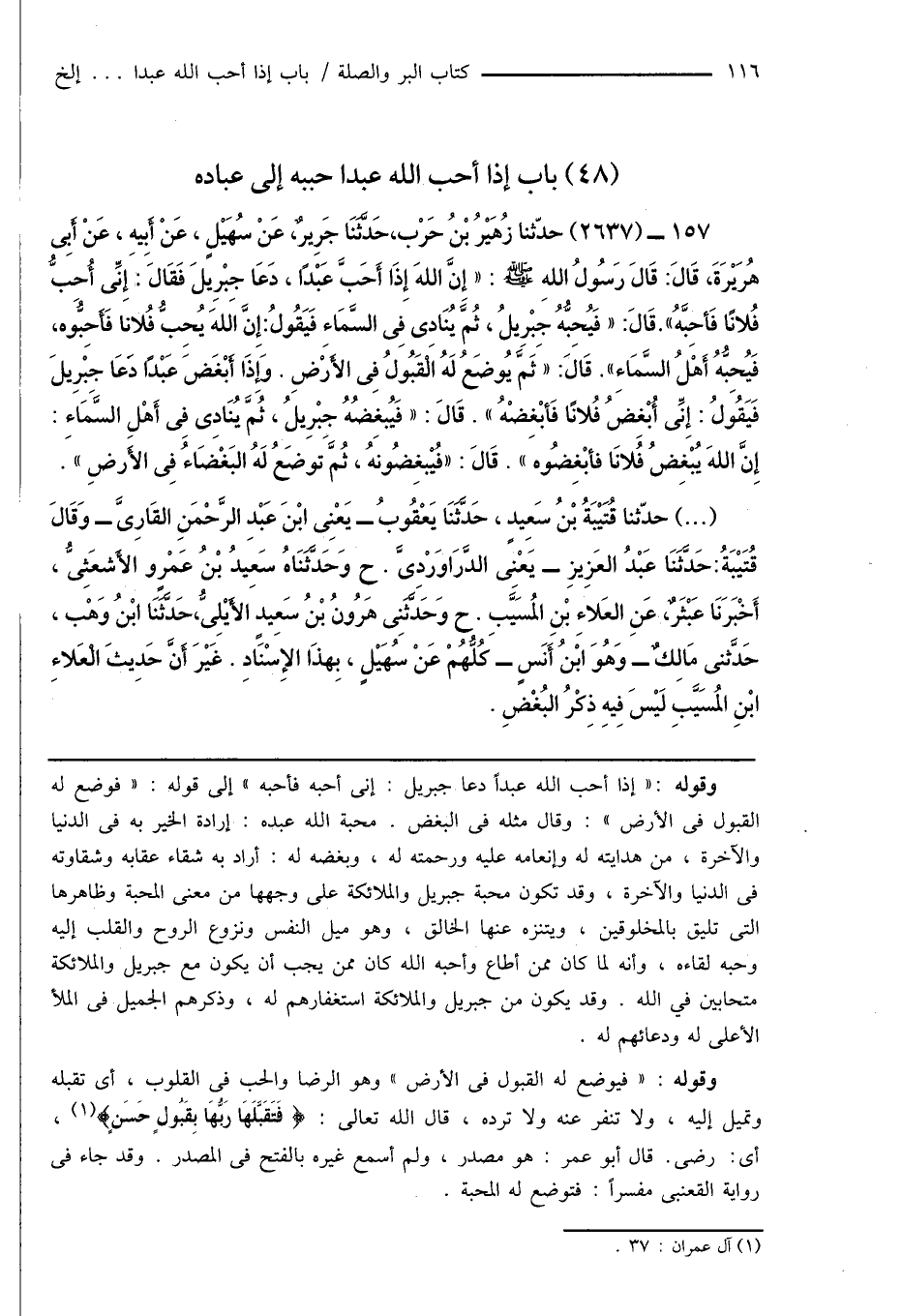 157 - (2637) حَدَّثَنَا زُهَيْرُ بْنُ حَرْبٍ، حَدَّثَنَا جَرِيرٌ، عَنْ سُهَيْلٍ، عَنْ أَبِيهِ، عَنْ أَبِى هُرَيْرَةَ، قَالَ: قَالَ رَسُولُ اللَّهِ صَلَّى اللَّهُ عَلَيْهِ وَسَلَّمَ: " إِنَّ اللَّهَ إِذَا أَحَبَّ عَبْدًا، دَعَا جِبْرِيلَ فَقَالَ: إِنِّى أُحِبُّ فُلَانًا فَأَحِبَّهُ ". قَالَ: " فَيُحِبُّهُ جِبْرِيلُ، ثُمَّ يُنَادِى فِى السَّمَاءِ فَيَقُولُ: إِنَّ اللَّهَ يُحِبُّ فُلَانًا فَأَحِبُّوهُ، فَيُحِبُّهُ أَهْلُ السَّمَاءِ ". قَالَ: " ثُمَّ يُوضَعُ لَهُ الْقَبُولُ فِى الْأَرْضِ. وَإِذَا أَبْغَضَ عَبْدًا دَعَا جِبْرِيلَ فَيَقُولُ: إِنِّى أُبْغِضُ فُلَانًا فَأَبْغِضْهُ ". قَالَ: " فَيُبْغِضُهُ جِبْرِيلُ، ثُمَّ يُنَادِى فِى أَهْلِ السَّمَاءِ: إِنَّ اللَّهَ يُبْغِضُ فُلَانًا فَأَبْغِضُوهُ ". قَالَ: " فَيُبْغِضُونَهُ، ثُمَّ تُوضَعُ لَهُ الْبَغْضَاءُ فِى الْأَرْضِ ".