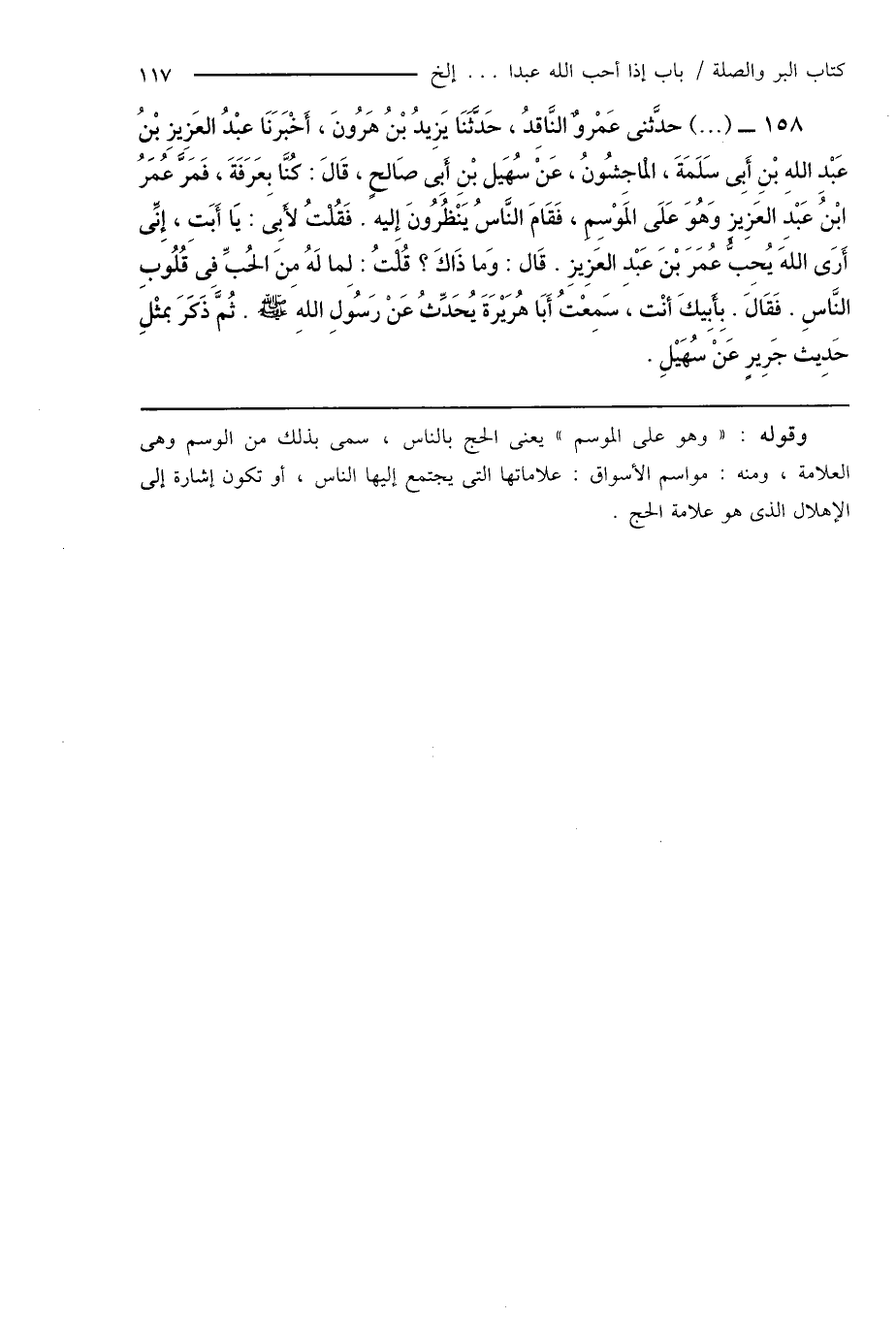 158 - (...) حَدَّثَنِى عَمْرٌو النَّاقِدُ، حَدَّثَنَا يَزِيدُ بْنُ هَارُونَ، أَخْبَرَنَا عَبْدُ الْعَزِيزِ بْنُ عَبْدِ اللَّهِ بْنِ أَبِى سَلَمَةَ، الْمَاجِشُونُ، عَنْ سُهَيْلِ بْنِ أَبِى صَالِحٍ، قَالَ: كُنَّا بِعَرَفَةَ، فَمَرَّ عُمَرُ بْنُ عَبْدِ الْعَزِيزِ وَهُوَ عَلَى الْمَوْسِمِ، فَقَامَ النَّاسُ يَنْظُرُونَ إِلَيْهِ. فَقُلْتُ لِأَبِى: يَا أَبَتِ، إِنِّى أَرَى اللَّهَ يُحِبُّ عُمَرَ بْنَ عَبْدِ الْعَزِيزِ. قَالَ: وَمَا ذَاكَ؟ قُلْتُ: لِمَا لَهُ مِنْ الْحُبِّ فِى قُلُوبِ النَّاسِ. فَقَالَ: بِأَبِيكَ أَنْتَ، سَمِعْتُ أَبَا هُرَيْرَةَ يُحَدِّثُ عَنْ رَسُولِ اللَّهِ صَلَّى اللَّهُ عَلَيْهِ وَسَلَّمَ. ثُمَّ ذَكَرَ بِمِثْلِ حَدِيثِ جَرِيرٍ عَنْ سُهَيْلٍ.