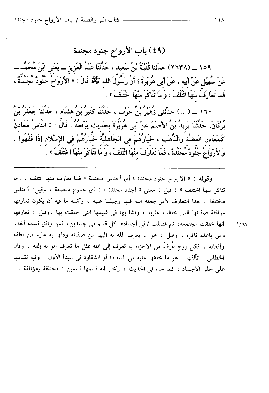 159 - (2638) حَدَّثَنَا قُتَيْبَةُ بْنُ سَعِيدٍ، حَدَّثَنَا عَبْدُ الْعَزِيزِ - يَعْنِى ابْنَ مُحَمَّدٍ - عَنْ سُهَيْلٍ عَنْ أَبِيهِ، عَنْ أَبِى هُرَيْرَةَ؛ أَنَّ رَسُولَ اللَّهِ صَلَّى اللَّهُ عَلَيْهِ وَسَلَّمَ قَالَ: " الْأَرْوَاحُ جُنُودٌ مُجَنَّدَةٌ، فَمَا تَعَارَفَ مِنْهَا ائْتَلَفَ، وَمَا تَنَاكَرَ مِنْهَا اخْتَلَفَ ".