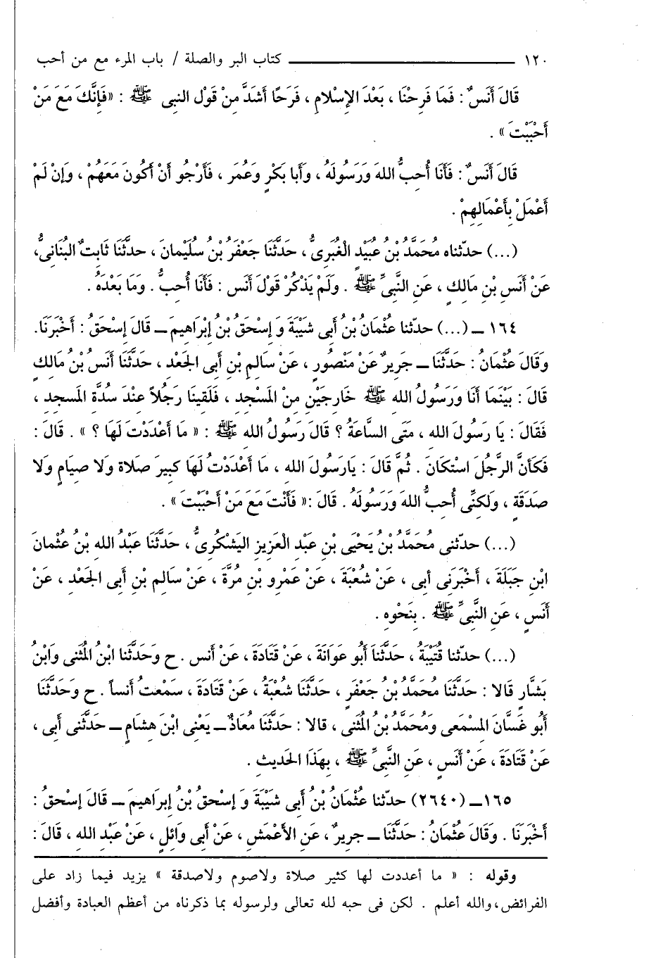 164 - (...) حَدَّثَنَا عُثْمَانُ بْنُ أَبِى شَيْبَةَ وَإِسْحَاقُ بْنُ إِبْرَاهِيمَ - قَالَ إِسْحَاقُ: أَخْبَرَنَا. وقَالَ عُثْمَانُ: حَدَّثَنَا - جَرِيرٌ عَنْ مَنْصُورٍ، عَنْ سَالِمِ بْنِ أَبِى الْجَعْدِ، حَدَّثَنَا أَنَسُ بْنُ مَالِكٍ قَالَ: بَيْنَمَا أَنَا وَرَسُولُ اللَّهِ صَلَّى اللَّهُ عَلَيْهِ وَسَلَّمَ خَارِجَيْنِ مِنْ الْمَسْجِدِ، فَلَقِينَا رَجُلًا عِنْدَ سُدَّةِ الْمَسْجِدِ، فَقَالَ: يَا رَسُولَ اللَّهِ، مَتَى السَّاعَةُ؟ قَالَ رَسُولُ اللَّهِ صَلَّى اللَّهُ عَلَيْهِ وَسَلَّمَ: " مَا أَعْدَدْتَ لَهَا؟ ". قَالَ فَكَأَنَّ الرَّجُلَ اسْتَكَانَ. ثُمَّ قَالَ: يَا رَسُولَ اللَّهِ، مَا أَعْدَدْتُ لَهَا كَبِيرَ صَلَاةٍ وَلَا صِيَامٍ وَلَا صَدَقَةٍ، وَلَكِنِّى أُحِبُّ اللَّهَ وَرَسُولَهُ. قَالَ: " فَأَنْتَ مَعَ مَنْ أَحْبَبْتَ ".