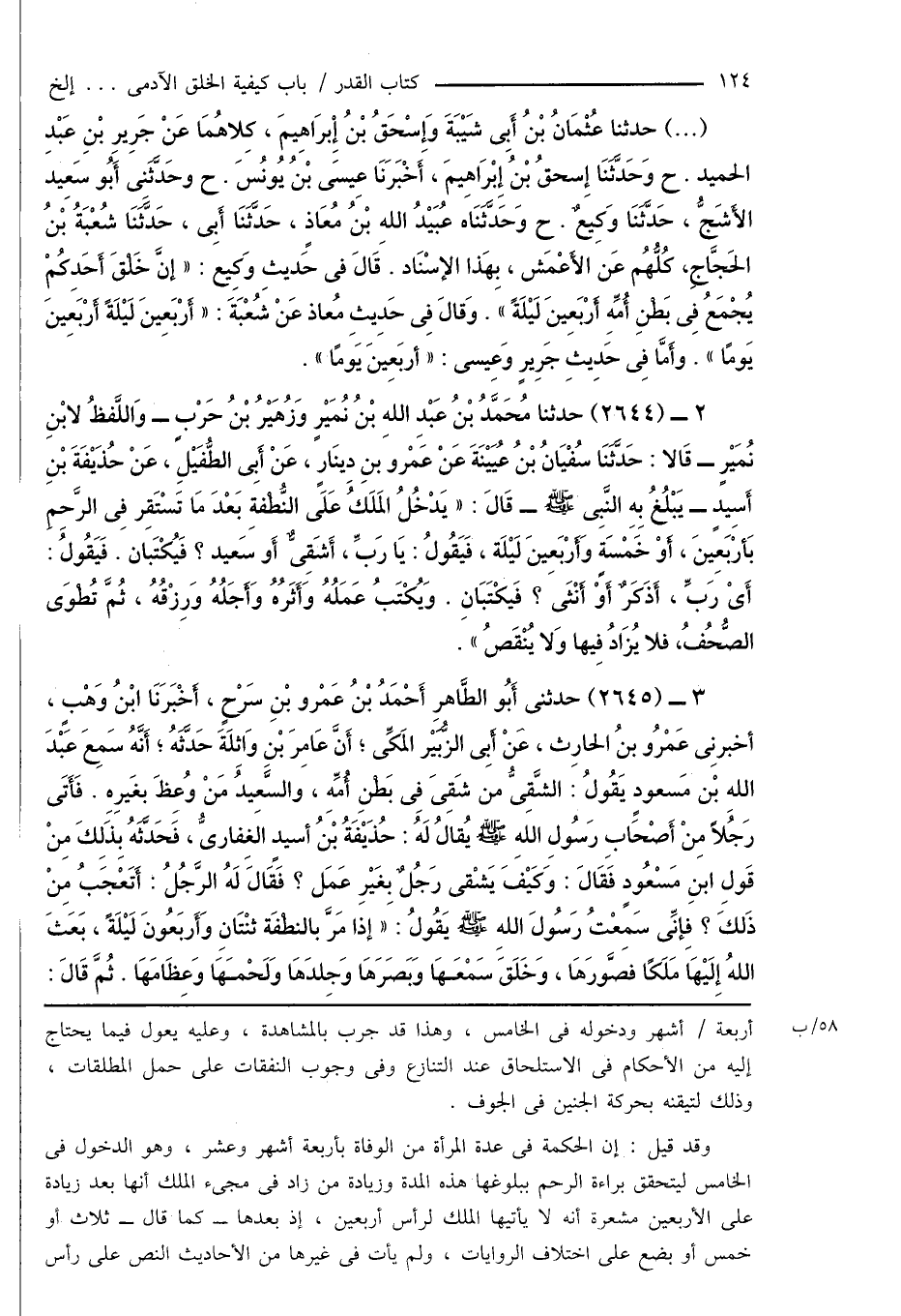 2 - (2644) حَدَّثَنَا مُحَمَّدُ بْنُ عَبْدِ اللَّهِ بْنِ نُمَيْرٍ وَزُهَيْرُ بْنُ حَرْبٍ - وَاللَّفْظُ لِابْنِ نُمَيْرٍ - قَالَا: حَدَّثَنَا سُفْيَانُ بْنُ عُيَيْنَةَ عَنْ عَمْرِو بْنِ دِينَارٍ، عَنْ أَبِى الطُّفَيْلِ، عَنْ حُذَيْفَةَ بْنِ أَسِيدٍ - يَبْلُغُ بِهِ النَّبِىَّ صَلَّى اللَّهُ عَلَيْهِ وَسَلَّمَ - قَالَ: " يَدْخُلُ الْمَلَكُ عَلَى النُّطْفَةِ بَعْدَ مَا تَسْتَقِرُّ فِى الرَّحِمِ بِأَرْبَعِينَ، أَوْ خَمْسَةٍ وَأَرْبَعِينَ لَيْلَةً، فَيَقُولُ: يَا رَبِّ، أَشَقِىٌّ أَوْ سَعِيدٌ؟ فَيُكْتَبَانِ. فَيَقُولُ: أَىْ رَبِّ، أَذَكَرٌ أَوْ أُنْثَى؟ فَيُكْتَبَانِ. وَيُكْتَبُ عَمَلُهُ وَأَثَرُهُ وَأَجَلُهُ وَرِزْقُهُ، ثُمَّ تُطْوَى الصُّحُفُ، فَلَا يُزَادُ فِيهَا وَلَا يُنْقَصُ ".
