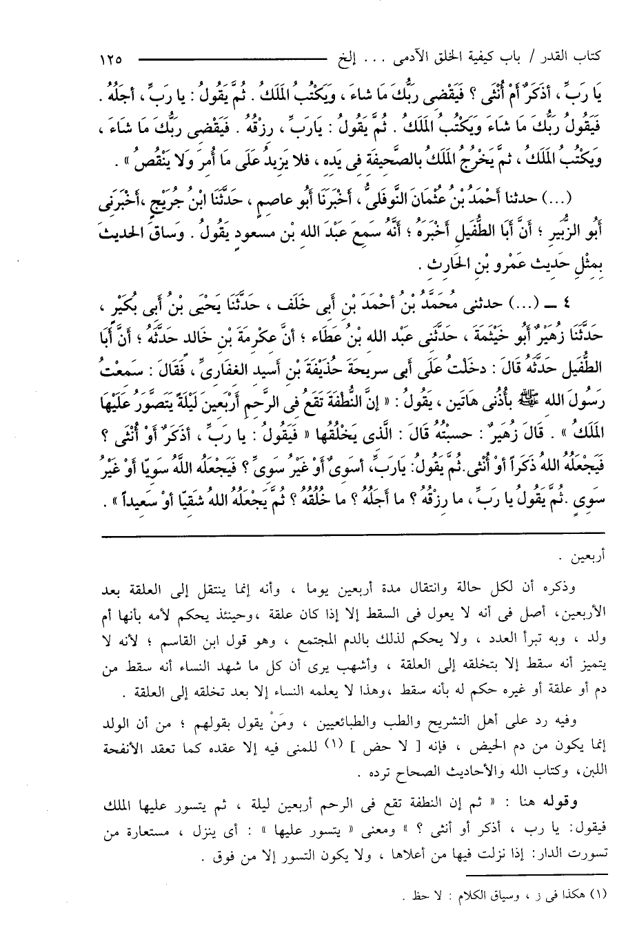 يَا رَبِّ، أَذَكَرٌ أَمْ أُنْثَى؟ فَيَقْضِى رَبُّكَ مَا شَاءَ، وَيَكْتُبُ الْمَلَكُ. ثُمَّ يَقُولُ: يَا رَبِّ، أَجَلُهُ. فَيَقُولُ رَبُّكَ مَا شَاءَ وَيَكْتُبُ الْمَلَكُ. ثُمَّ يَقُولُ: يَا رَبِّ، رِزْقُهُ. فَيَقْضِى رَبُّكَ مَا شَاءَ، وَيَكْتُبُ الْمَلَكُ، ثُمَّ يَخْرُجُ الْمَلَكُ بِالصَّحِيفَةِ فِى يَدِهِ، فَلَا يَزِيدُ عَلَى مَا أُمِرَ وَلَا يَنْقُصُ ".