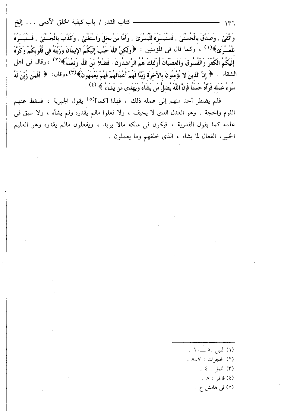 وَاتَّقَى. وَصَدَّقَ بِالحُسْنَى. فَسَنُيَسِّرُهُ لِلْيُسْرَى. وَأَمَّا مَنْ بَخِلَ وَاسْتَغْنَى. وَكَذَّبَ بِالحُسْنَى. فَسَنُيَسِّرُهُ لِلْعُسْرَى} (¬1)، وكما قال فى المؤمنين: {وَلَكِنَّ اللَّهَ حَبَّبَ إِلَيْكُمُ الإِيمَانَ وَزَيَّنَهُ فِى قُلُوبِكُمْ وَكَرَّهَ إِلَيْكُمُ الكُفْرَ وَالفُسُوقَ وَالعِصْيَانَ أُولَئِكَ هُمُ الرَّاشِدُونَ. فَضْلًا مِنَ اللَّهِ وَنِعْمَةً} (¬2)، وقال فى أهل الشقاء: {إِنَّ الَّذِينَ لَا يُؤْمِنُونَ بِالآخِرَةِ زَيَّنَّا لَهُمْ أَعْمَالَهُمْ فَهُمْ يَعْمَهُونَ} (¬3)، وقال: {أَفَمَنْ زُيِّنَ لَهُ سُوءُ عَمَلِهِ فَرَآهُ حَسَنًا فَإِنَّ اللَّهَ يُضِلُّ مَنْ يَشَاءُ وَيَهْدِي مَنْ يَشَاءُ} (¬4).