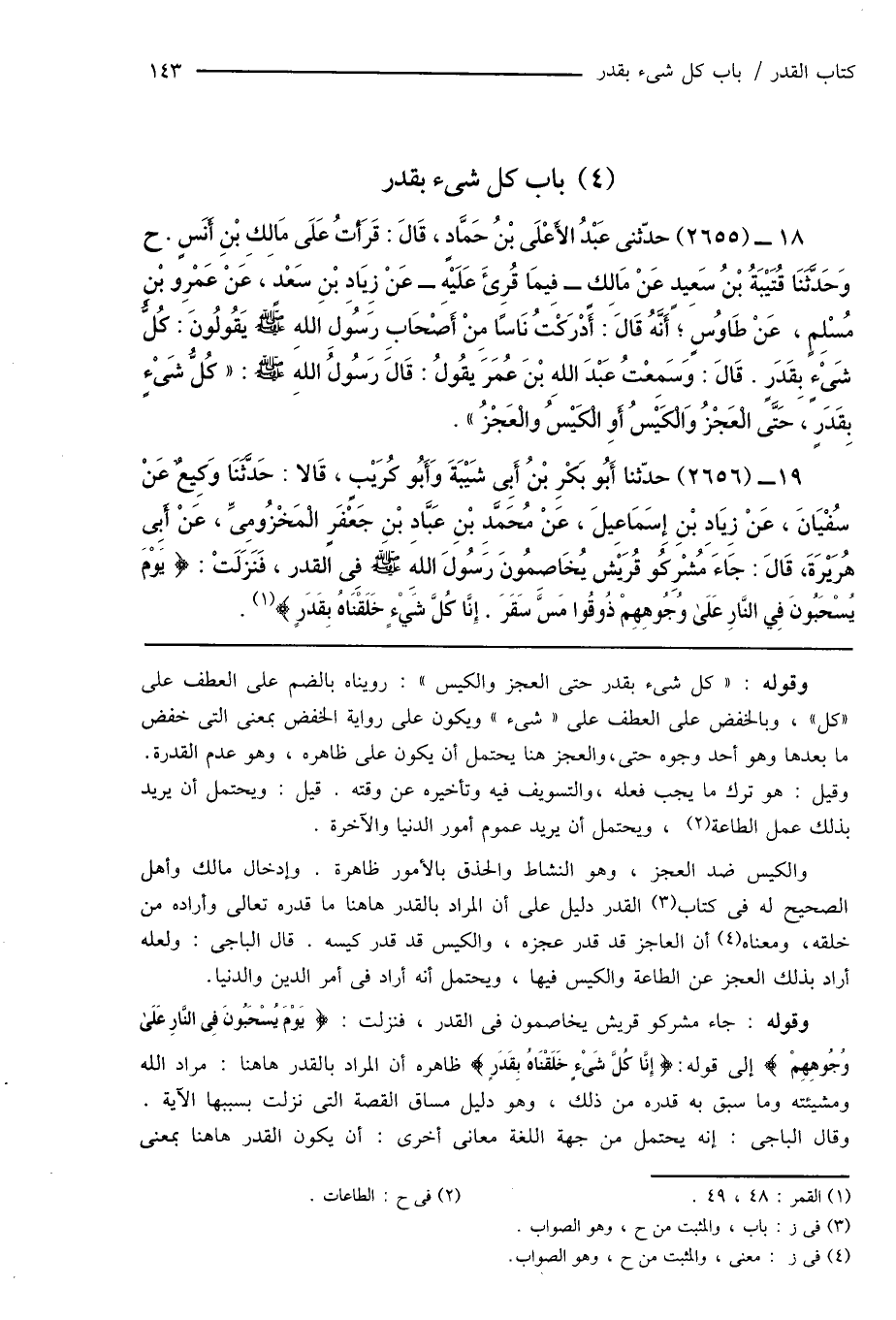 18 - (2655) حَدَّثَنِى عَبْدُ الْأَعْلَى بْنُ حَمَّادٍ، قَالَ: قَرَأْتُ عَلَى مَالِكِ بْنِ أَنَسٍ. ح وحَدَّثَنَا قُتَيْبَةُ بْنُ سَعِيدٍ عَنْ مَالِكٍ - فِيمَا قُرِئَ عَلَيْهِ - عَنْ زِيَادِ بْنِ سَعْدٍ، عَنْ عَمْرِو بْنِ مُسْلِمٍ، عَنْ طَاوُسٍ؛ أَنَّهُ قَالَ: أَدْرَكْتُ نَاسًا مِنْ أَصْحَابِ رَسُولِ اللَّهِ صَلَّى اللَّهُ عَلَيْهِ وَسَلَّمَ يَقُولُونَ: كُلُّ شَىْءٍ بِقَدَرٍ. قَالَ: وَسَمِعْتُ عَبْدَ اللَّهِ بْنَ عُمَرَ يَقُولُ: قَالَ رَسُولُ اللَّهِ صَلَّى اللَّهُ عَلَيْهِ وَسَلَّمَ: " كُلُّ شَىْءٍ بِقَدَرٍ، حَتَّى الْعَجْزِ وَالْكَيْسِ أَوْ الْكَيْسِ وَالْعَجْزِ ".