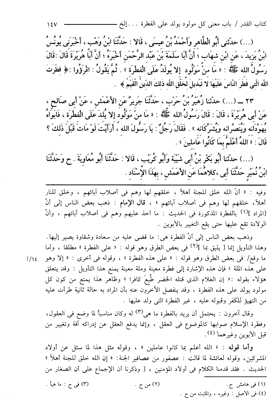 23 - (...) حَدَّثَنَا زُهَيْرُ بْنُ حَرْبٍ، حَدَّثَنَا جَرِيرٌ عَنْ الْأَعْمَشِ، عَنْ أَبِى صَالِحٍ، عَنْ أَبِى هُرَيْرَةَ، قَالَ: قَالَ رَسُولُ اللَّهِ صَلَّى اللَّهُ عَلَيْهِ وَسَلَّمَ: " مَا مِنْ مَوْلُودٍ إِلَّا يُولَدُ عَلَى الْفِطْرَةِ، فَأَبَوَاهُ يُهَوِّدَانِهِ وَيُنَصِّرَانِهِ وَيُشَرِّكَانِهِ ". فَقَالَ رَجُلٌ: يَا رَسُولَ اللَّهِ، أَرَأَيْتَ لَوْ مَاتَ قَبْلَ ذَلِكَ؟ قَالَ: " اللَّهُ أَعْلَمُ بِمَا كَانُوا عَامِلِينَ ".