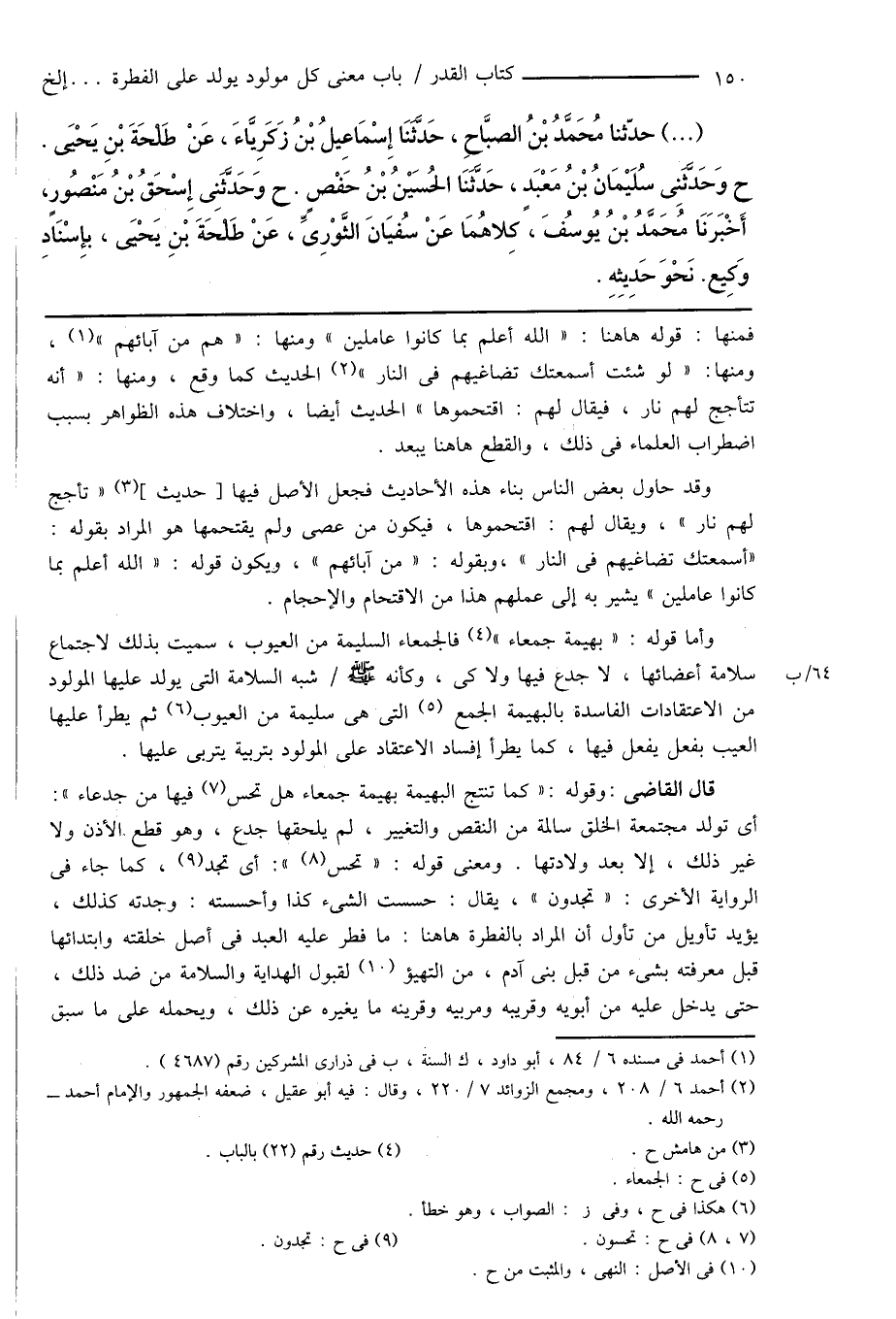 قال القاضى: وقوله: " كما تنتج البهيمة بهيمة جمعاء هل تحس (¬7) فيها من جدعاء ": أى تولد مجتمعة الخلق سالمة من النقص والتغيير، لم يلحقها جدع، وهو قطع الأذن ولا غير ذلك، إلا بعد ولادتها. ومعنى قوله: " تحس (¬8) ": أى تجد (¬9)، كما جاء فى الرواية الأخرى: " تجدون "، يقال: حسست الشىء كذا وأحسسته: وجدته كذلك، يؤيد تأويل من تأول أن المراد بالفطرة هاهنا: ما فطر عليه العبد فى أصل خلقته وابتدائها قبل معرفته بشىء من قبل بنى آدم، من التهيؤ (¬10) لقبول الهداية والسلامة من ضد ذلك، حتى يدخل عليه من أبويه وقريبه ومربيه وقرينه ما يغيره عن ذلك، ويحمله على ما سبق