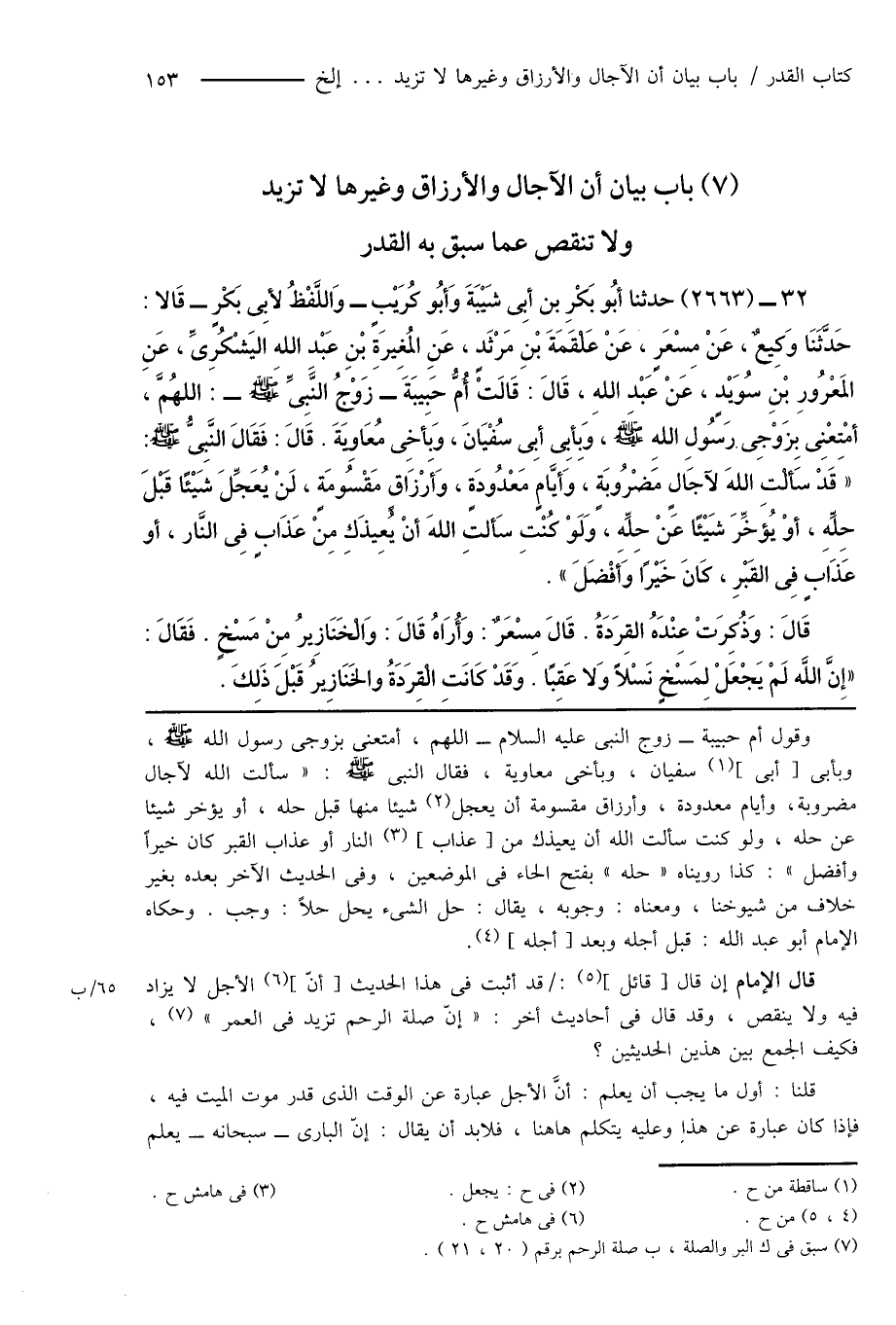 (7) باب بيان أن الآجال والأرزاق وغيرها لا تزيد ولاتنقص عما سبق به القدر