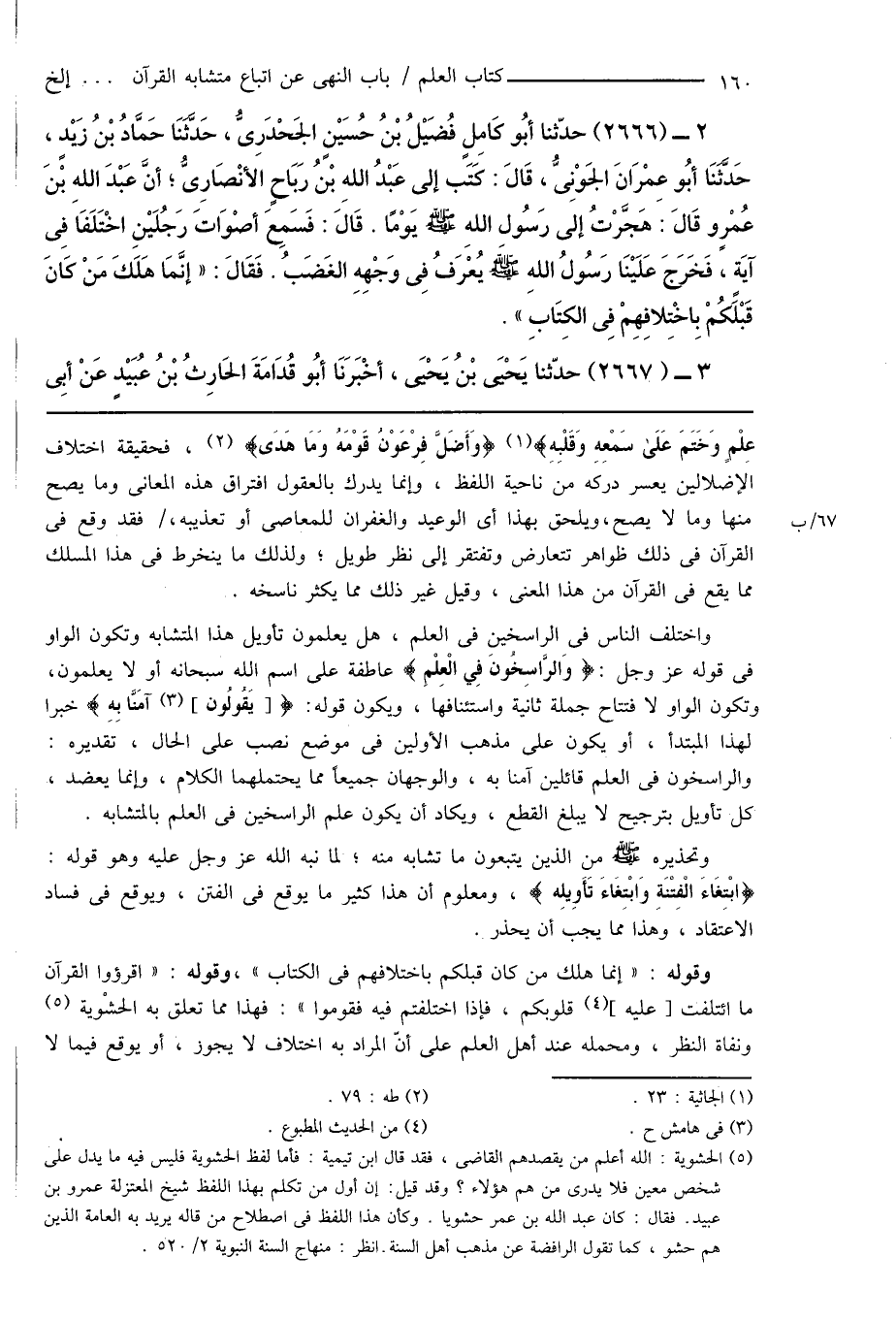2 - (2666) حدّثنا أَبُو كَامِلٍ فُضَيْلُ بْنُ حُسَيْنٍ الجَحْدَرِىُّ، حَدَّثَنَا حَمَّادُ بْنُ زَيْدٍ، حَدَّثَنَا أَبُو عِمْرَانَ الجَوْنِىُّ، قَالَ: كَتَب إلى عَبْدُ اللهِ بْنُ رَبَاحٍ الأنْصَارِىُّ؛ أنَّ عَبْدَ اللهِ بْنَ عمْرٍو قَالَ: هَجَّرْتُ إلى رَسُول اللهِ صَلَّى اللَّهُ عَلَيْهِ وَسَلَّمَ يَوْمًا. قَالَ: فَسَمِعَ أصْوَاتَ رَجُلَيْنِ اخْتَلَفَاَ فِى آيَة، فَخَرَجَ عَلَيْنَا رَسُولُ اللهِ صَلَّى اللَّهُ عَلَيْهِ وَسَلَّمَ يُعْرَفُ فِى وَجْهِهِ الغَضَبُ. فَقَالَ: " إنَّمَا هَلَكَ مَنْ كانَ قَبْلَكُمْ بِاخْتِلافِهِمْ فِى الكِتَابِ ".