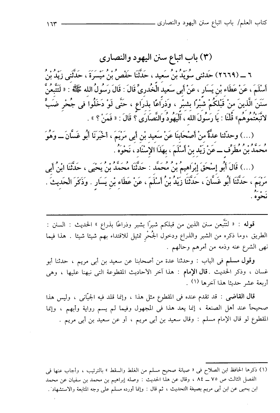 6 - (2669) حَدَّثَنِى سُوَيْدُ بْنُ سَعِيد، حَدَّثَنَا حَفْصُ بْنُ مَيْسَرَةَ، حَدَّثَنِى زَيْدُ بْنُ أَسْلَمَ، عَنْ عَطَاءِ بْنِ يَسَارٍ، عَنْ أَبِى سَعِيدٍ الْخُدرِىِّ قَالَ: قَالَ رَسُولُ اللِه صَلَّى اللَّهُ عَلَيْهِ وَسَلَّمَ: " لَتَتَّبِعُنَّ سَنَنَ الَّذِينَ مِنْ قَبْلِكُمْ شِبْرًا بشبْرٍ، وَذِرَاعًا بِذِرَاعٍ، حَتَّى لَوْ دَخَلُوا فى جُحْرِ ضَبٍّ لاتَبَعْتُمُوهُم " قُلْنَا: يَا رَسُولَ اللهِ، آلْيَهُودُ وَالنَّصَارَى؟ قَالَ: " فَمَنْ؟ ".