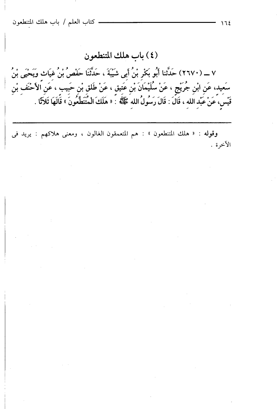 7 - (2670) حَدَّثنا أَبُو بَكْرِ بْنُ أَبِى شَيْبَةَ، حَدَّثَنَا حَفْصُ بْنُ غِيَاثٍ وَيَحْيَى بْنُ سَعِيدٍ، عَنِ ابْنِ جُرَيْجٍ، عَنْ سُلَيْمَانَ بْنِ عَتيقٍ، عَنْ طَلقِ بْن حَبِيبٍ، عَنِ الأَحْنَفِ بْنِ قَيْسٍ، عَنْ عَبْدِ اللهِ، قَالَ: قَالَ رَسُولُ اللهِ صَلَّى اللَّهُ عَلَيْهِ وَسَلَّمَ: ((هَلَكَ الْمُتَنَطِّعُونَ " قَالَهَا ثَلاثًا.