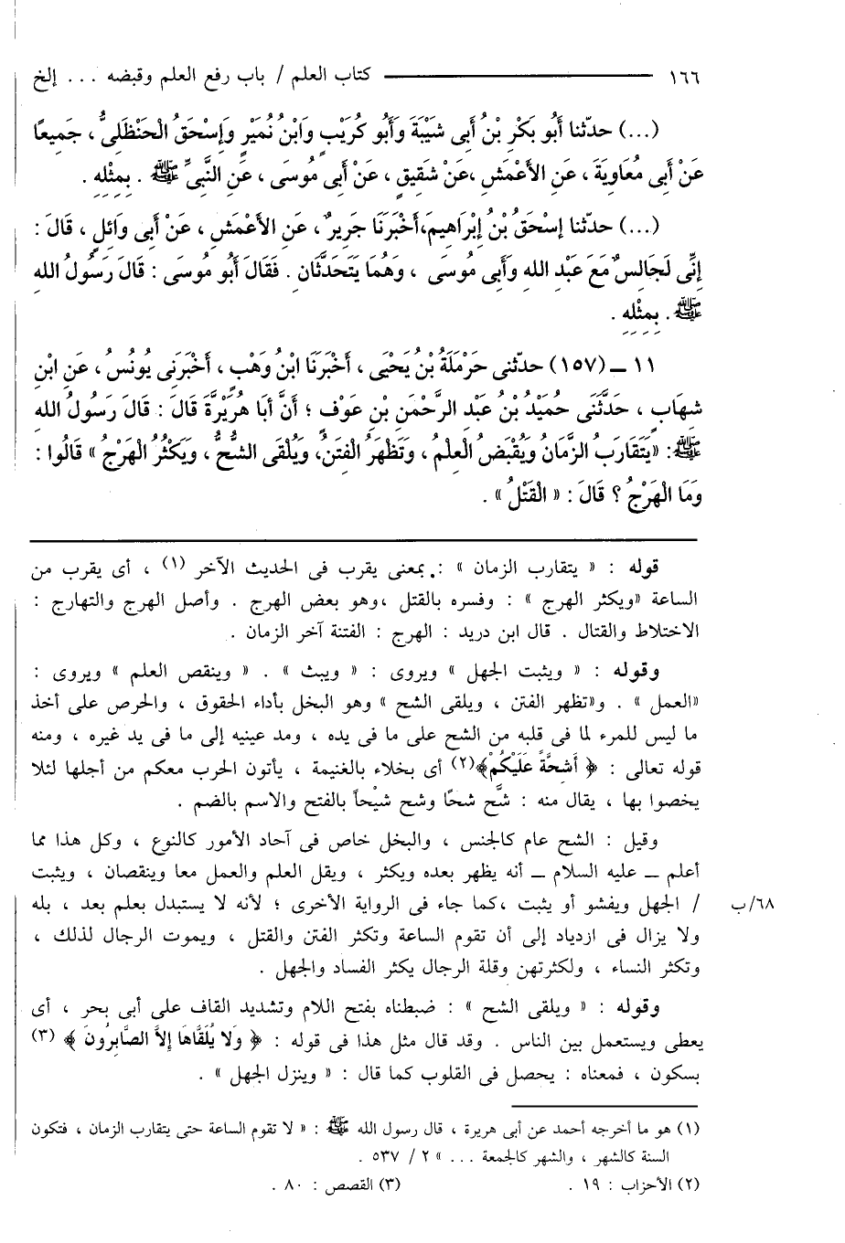 11 - (157) حدّثنى حَرْمَلَةُ بْنُ يَحْيَى، أَخْبَرَنَا ابْنُ وَهْبٍ، أَخْبَرَنِى يُونُسُ، عَنِ ابْنِ شِهَابٍ، حَدَّثَنَى حُمَيْدُ بْنُ عَبْدِ الرَّحْمَنِ بْنِ عَوْفٍ؟ أَنَّ أَبَا هُرَيْرَّةَ قَالَ: قَالَ رَسُولُ اللهِ صَلَّى اللَّهُ عَلَيْهِ وَسَلَّمَ: " يَتَقَارَبُ الزَّمَانُ وَيُقْبَضُ الْعِلْمُ، وَتَظْهَرُ الْفِتَنُ، وَيُلْقَى الشُّحُّ، وَيَكْثُرُ الْهَرْجُ " قَالُوا: وَمَا الْهَرْجُ؟ قَالَ: " الْقَتْلُ ".